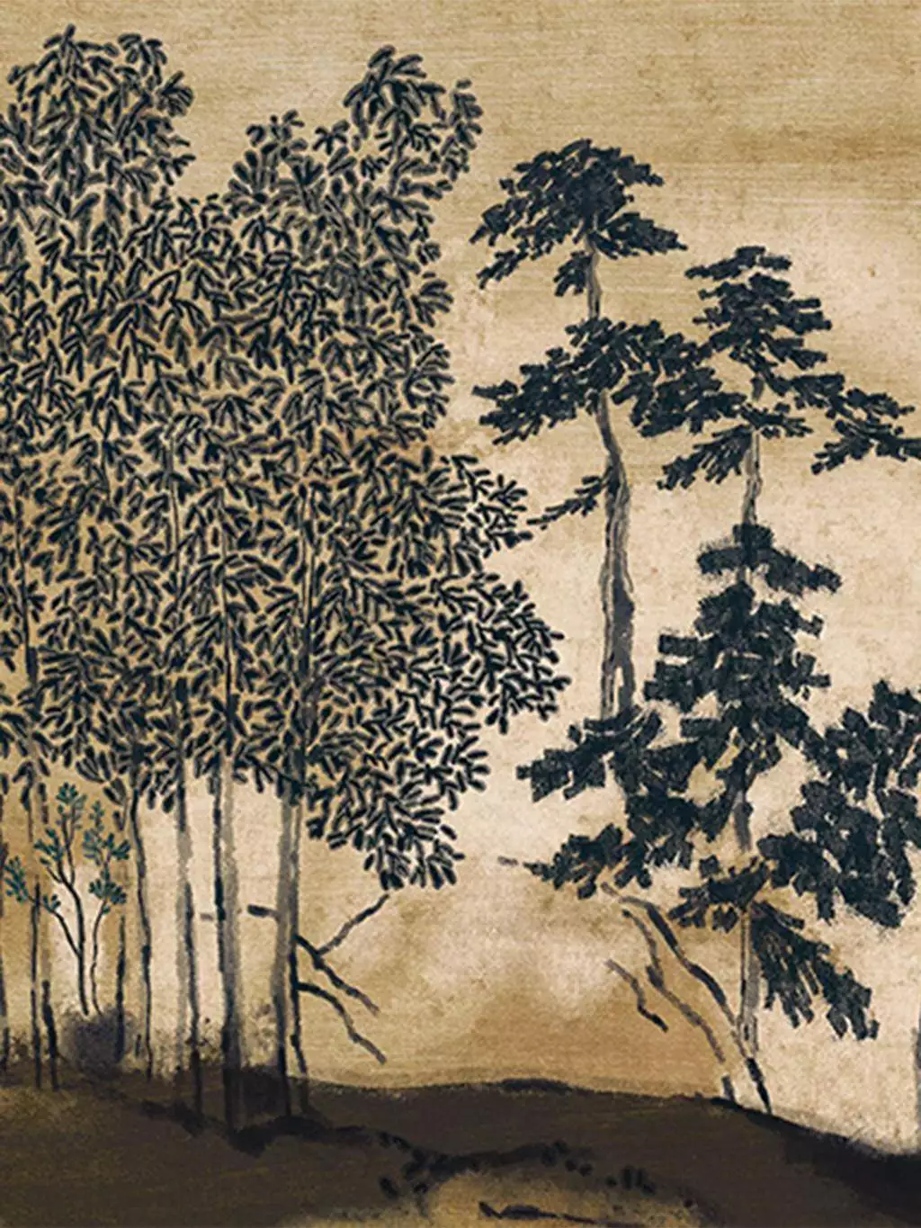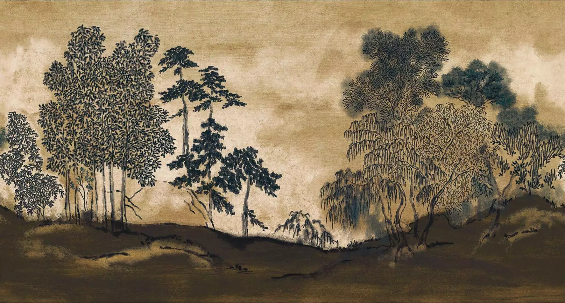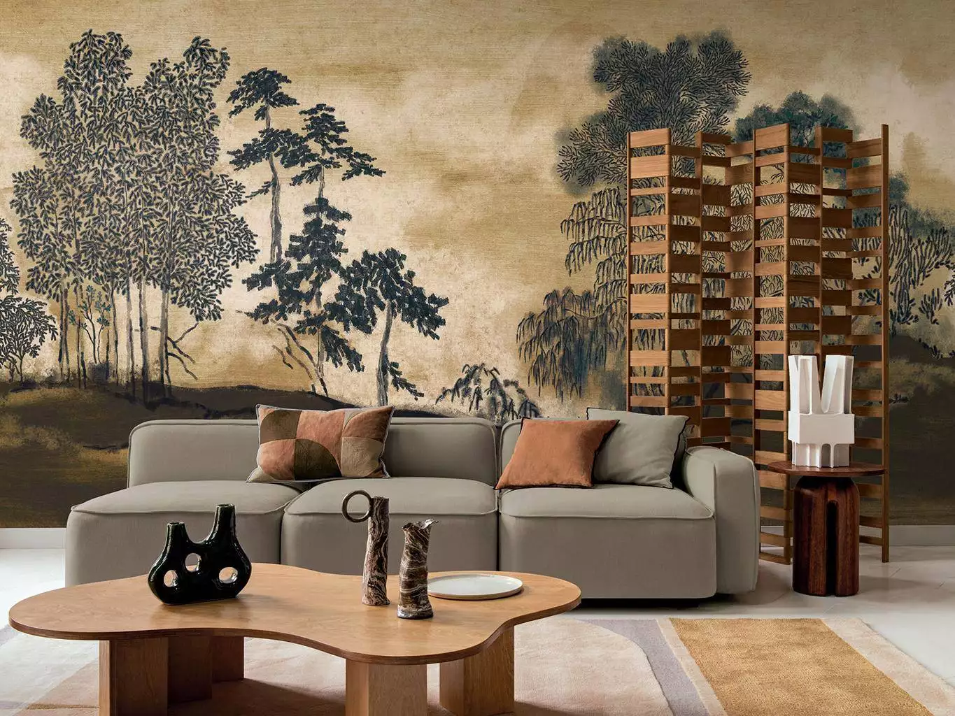 „Koraku“ interpretiert fernöstliche Landschaftstradition als modernes Wandbild. Die Tapete aus der Serie Panoramas 4 zeigt ein ausdrucksstarkes Waldmotiv auf warmem Fond in gealtertem Goldton. Tiefes Charcoal konturiert die Vegetation, wodurch eine grafische Spannung entsteht. Die metallisch schimmernde Oberfläche und die faserige Struktur verleihen dem Panorama eine textile Tiefe. In col. 0304 entsteht eine kraftvolle Szenerie, die Natur und Abstraktion miteinander verbindet. Das Zusammenspiel von Farbe, Materialität und Motiv erzeugt eine ruhige Präsenz – wie ein gemaltes Gleichgewicht zwischen Schatten und Licht.