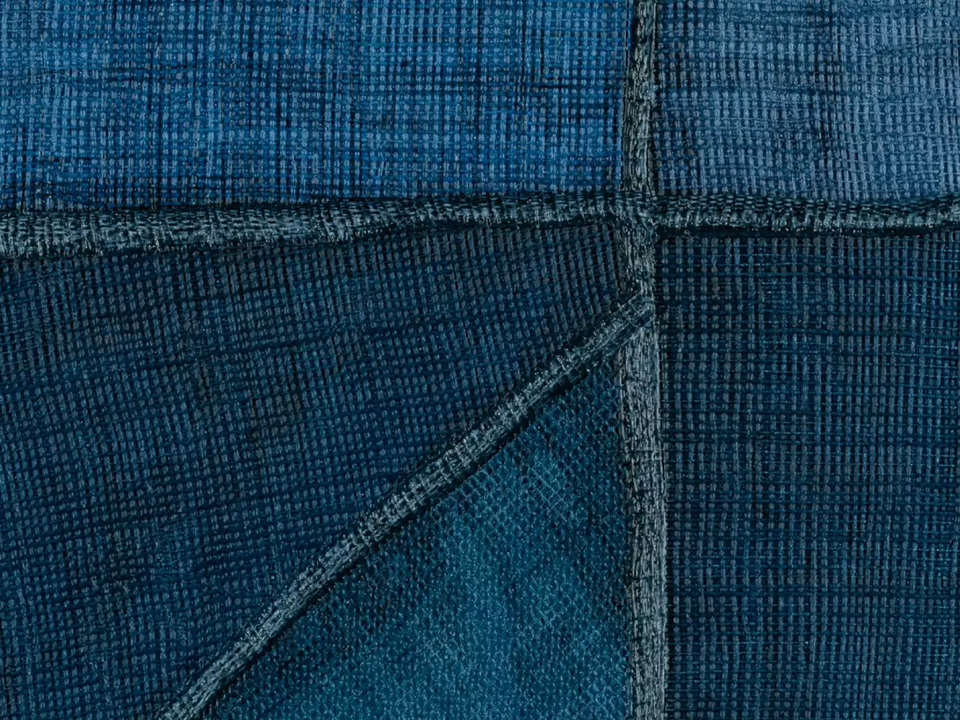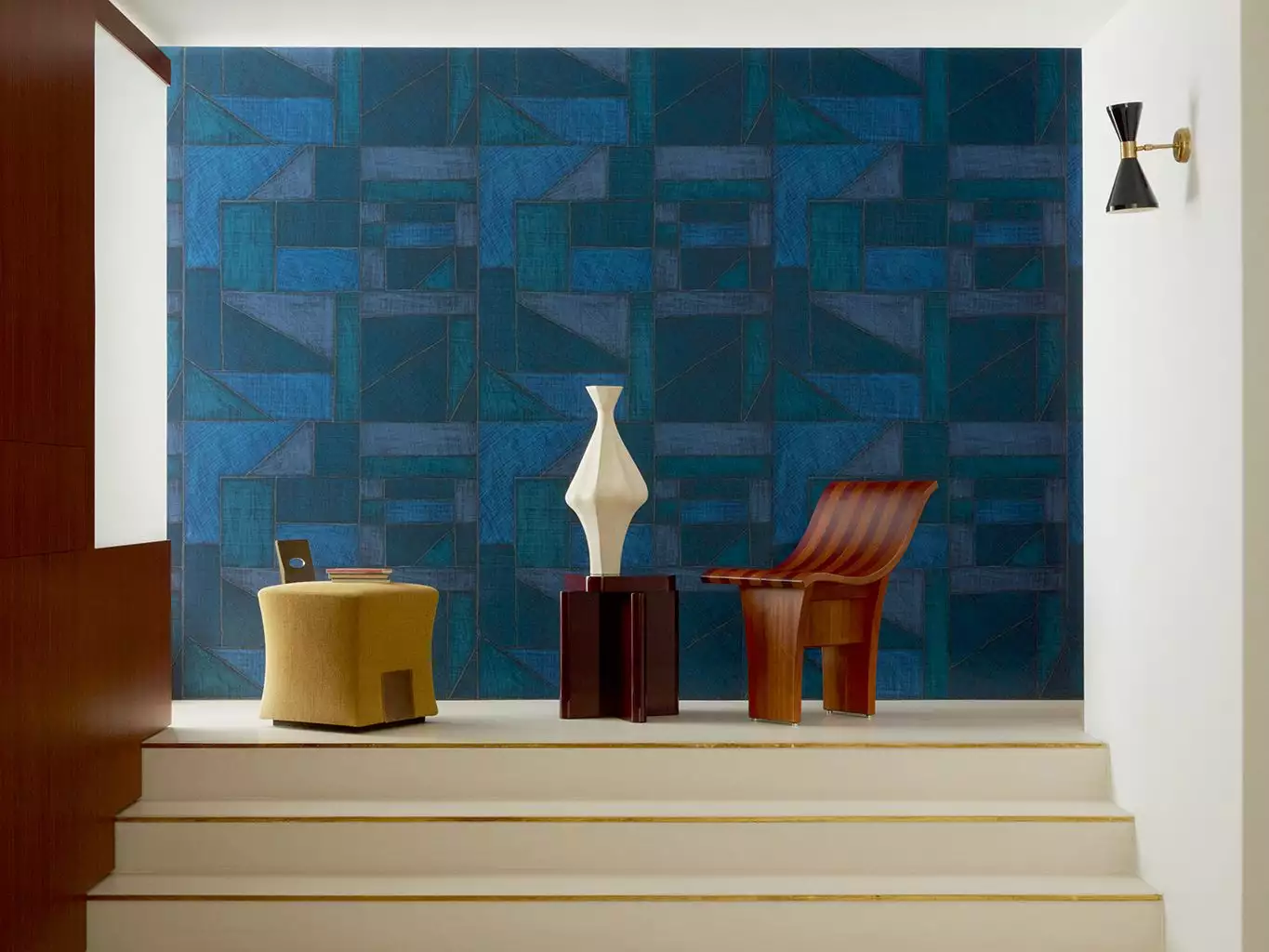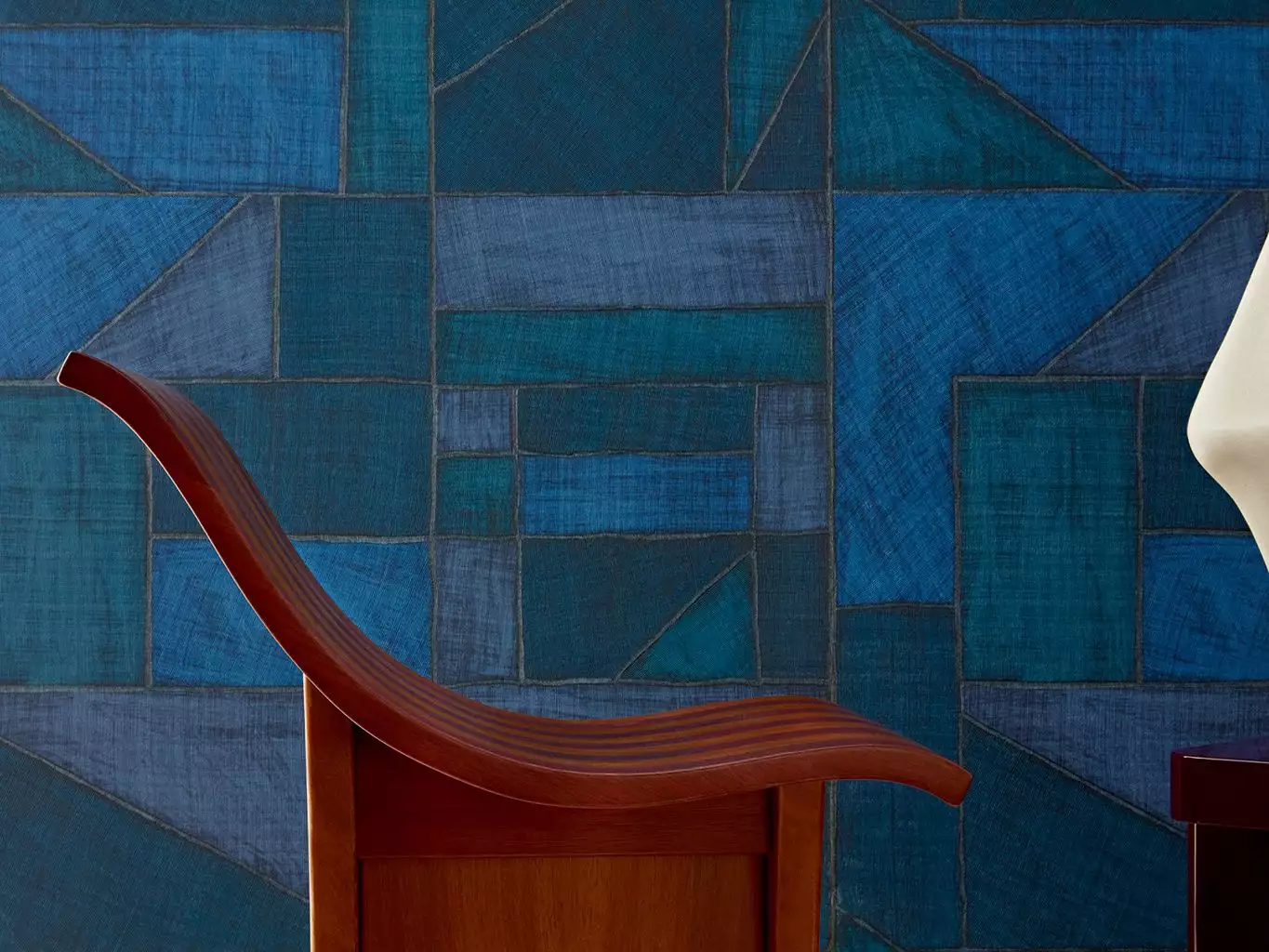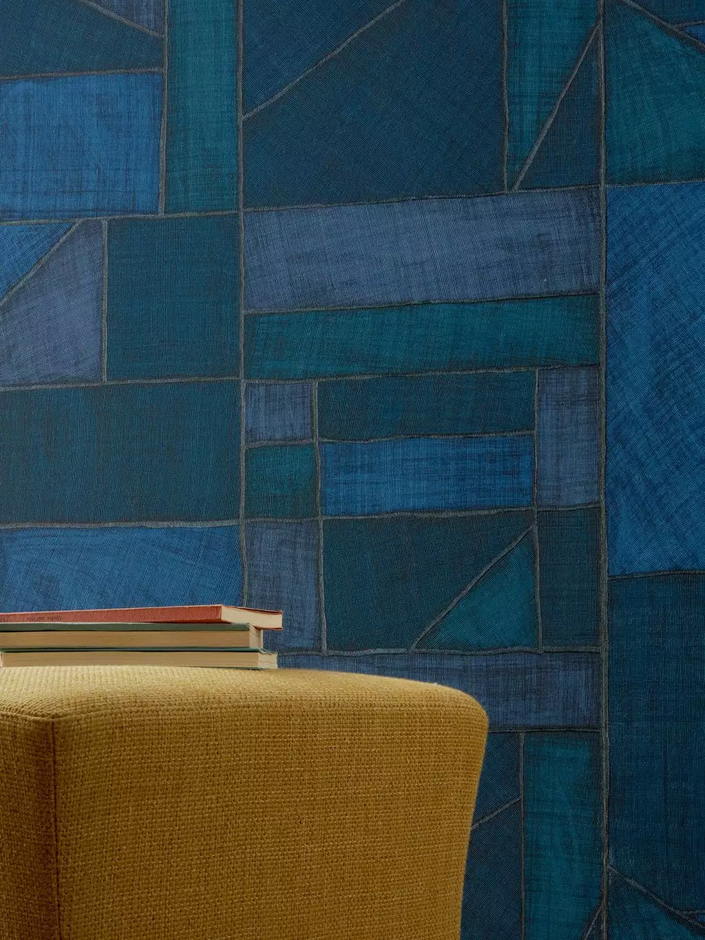 Grafische Tapete mit unterschiedlichen, dunklen Blautönen.