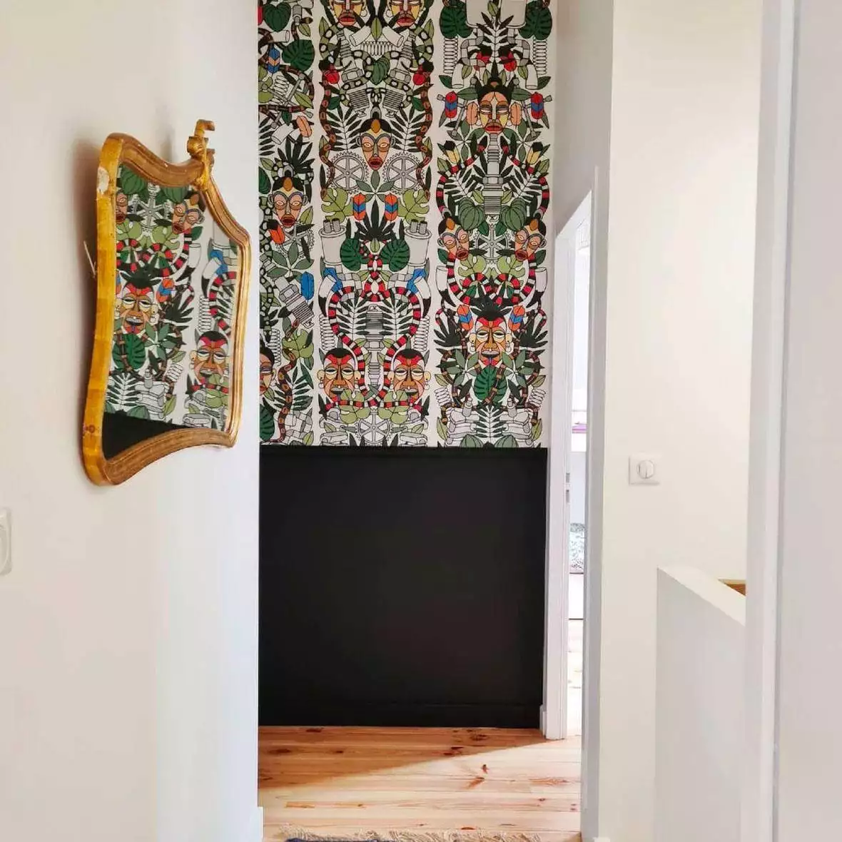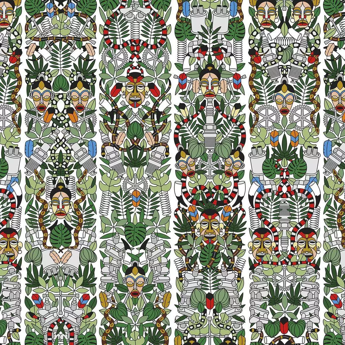 Die Tapete „L’Afrique“ von NLXL bringt ein grafisches Gefüge aus Ornament, Natur und Artefakt in die Einrichtung. Symmetrisch verdichtet, fast tektonisch aufgebaut, entfaltet das Motiv eine ruhige, aber eindringliche Präsenz. Maskenhafte Gesichter, Blattwerk und technische Elemente greifen ineinander, präzise gespiegelt, fast mechanisch komponiert. Die Farbigkeit bleibt kontrolliert, mit lebendigen Akzenten. Aus der Distanz ruhig, aus der Nähe narrativ. Insgesamt ein markantes, kultiviertes, bewusst gesetztes Design für starke Räume.