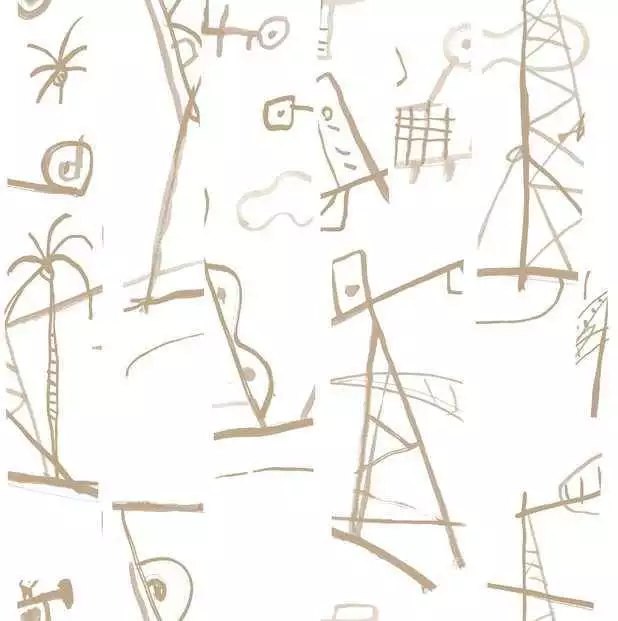 Natur pur oder absolute Industrialisierung? So ist die Erinnerung von Mariscal an Los Angeles. Mittels der Collage stellt er diese Dualität mit trapezförmigen Gebilden und dem Spiel der Sicht durch ein Kaleidoskop dar.