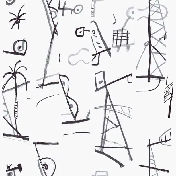 Natur pur oder absolute Industrialisierung? So ist die Erinnerung von Mariscal an Los Angeles. Mittels der Collage stellt er diese Dualität mit trapezförmigen Gebilden und dem Spiel der Sicht durch ein Kaleidoskop dar.