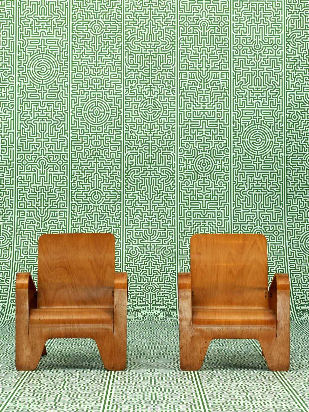 Mit der Designtapete Labyrinth wird Wand zum Weg: Streng geometrische Pfade in frischem Grün auf weißem Grund ziehen sich über die Fläche – ruhig geordnet, klar strukturiert. So verbindet die Tapete Moderne mit Klarheit und bringt Tiefe und grafischen Rhythmus in den Raum. Ideal, wenn Ihr Interieur reduzierte Linie lebt und gleichzeitig ein wirkungsvolles Highlight braucht. Das Design „Labyrinth“ wurde ursprünglich für die Polsterung eines MOOOI-Stuhls entworfen.