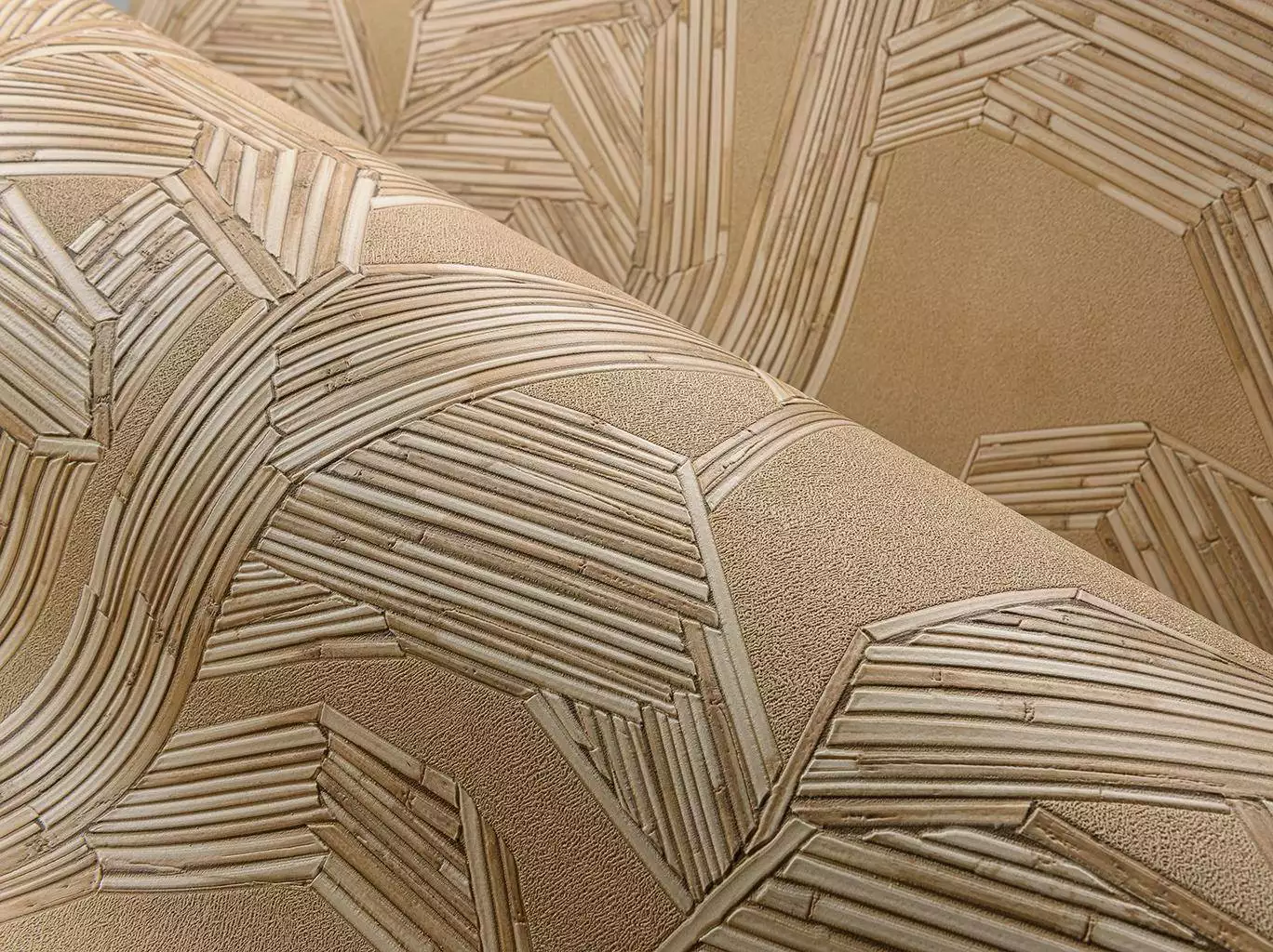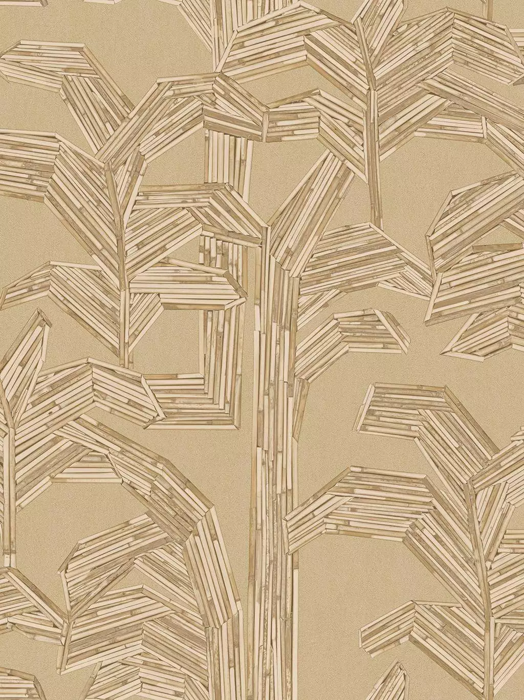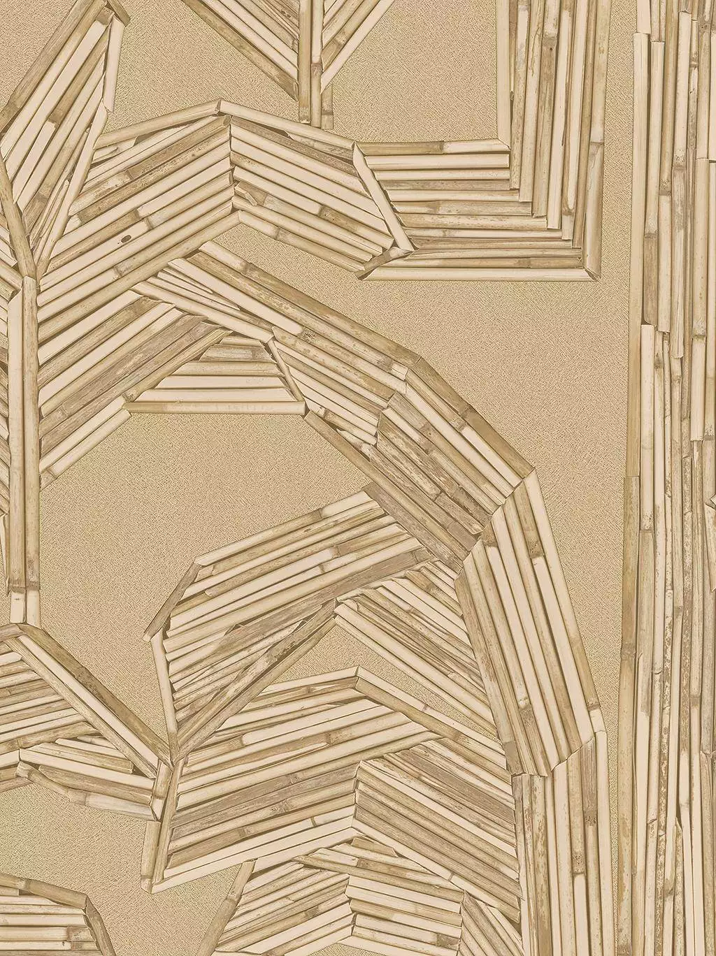 Die Tapete "Lanai Kailua, col. 02" hat eine wunderschöne, strukturierte Optik mit einem eleganten, geometrischen Muster, das an Bambus- oder Schilfrohre erinnert. Die warme, natürliche Farbgebung verleiht dem Raum eine gemütliche und luxuriöse Atmosphäre.