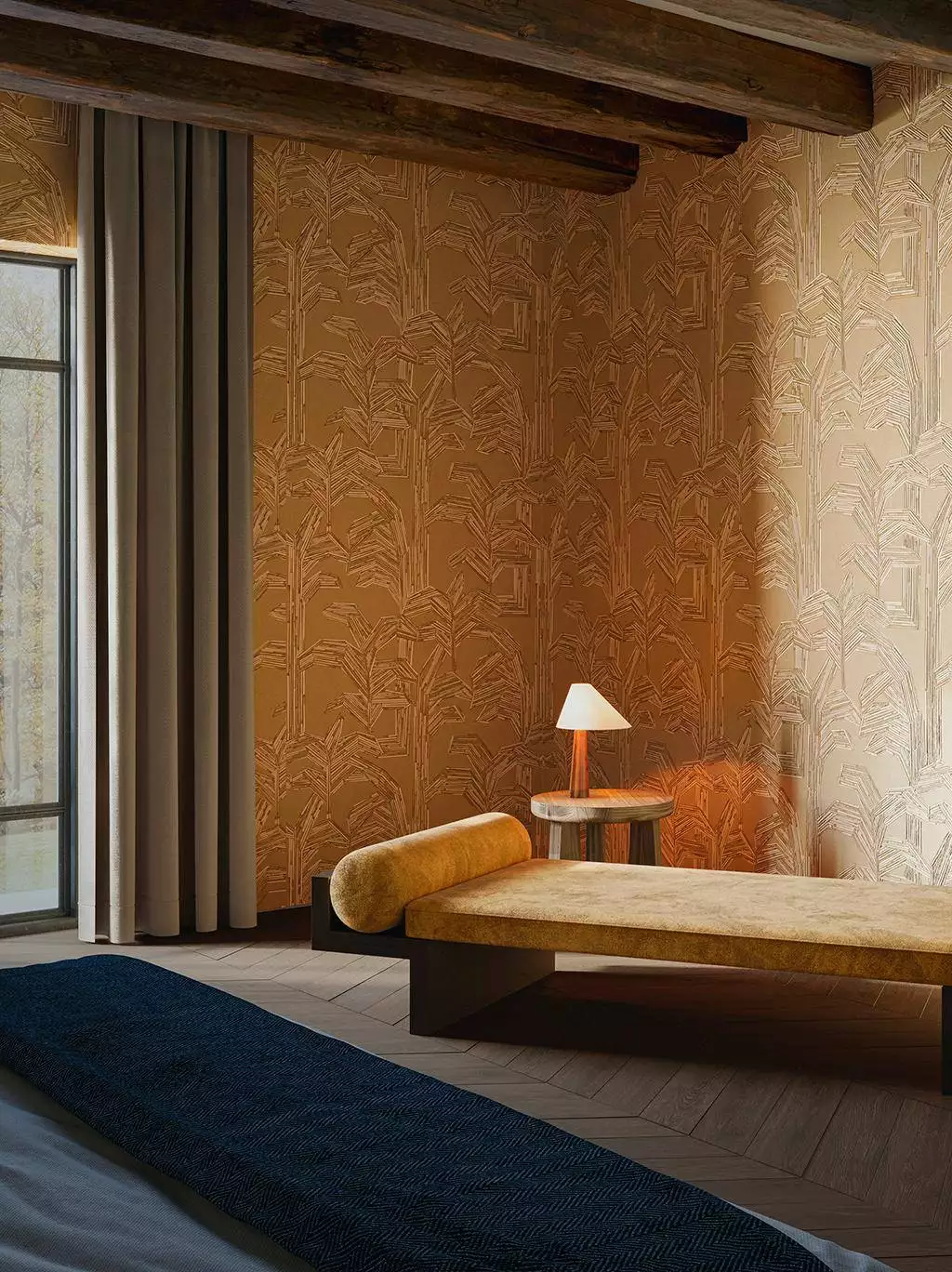 Die Tapete "Lanai Kailua, col. 02" hat eine wunderschöne, strukturierte Optik mit einem eleganten, geometrischen Muster, das an Bambus- oder Schilfrohre erinnert. Die warme, natürliche Farbgebung verleiht dem Raum eine gemütliche und luxuriöse Atmosphäre.