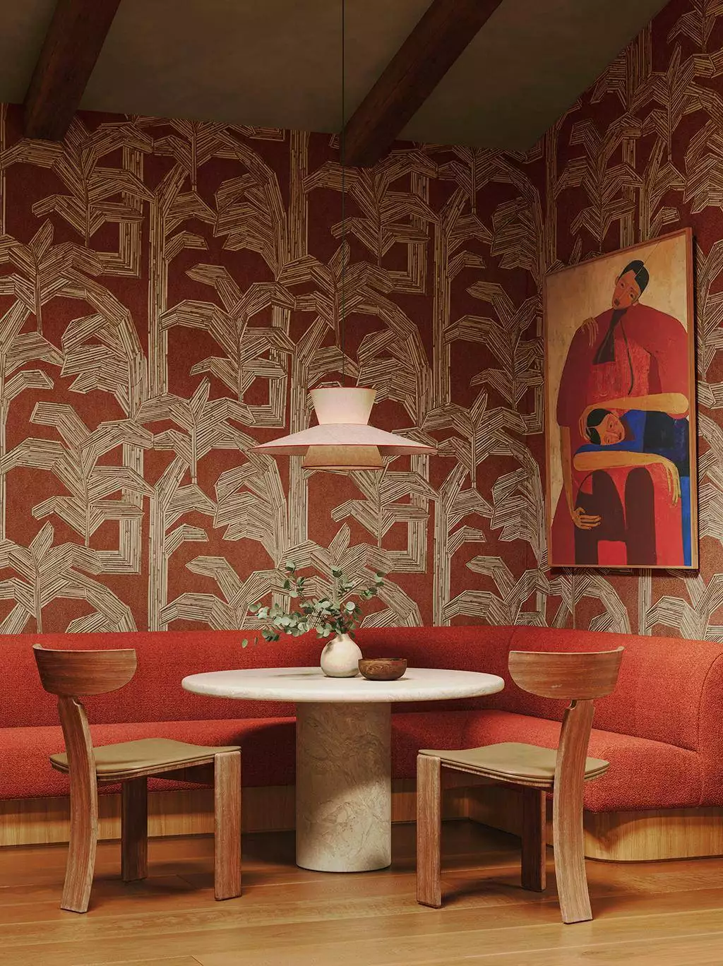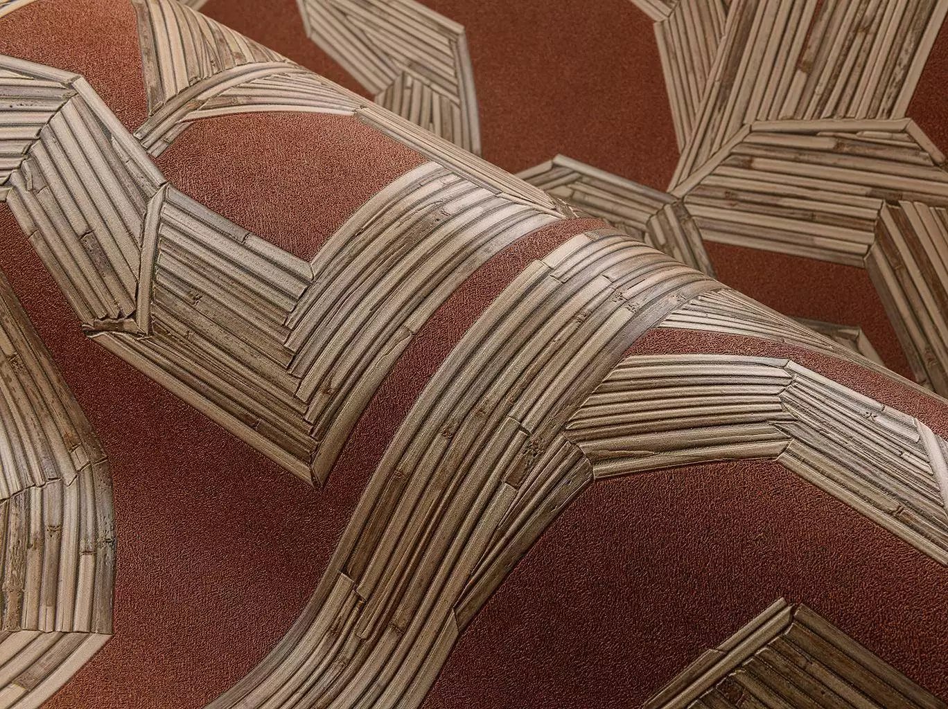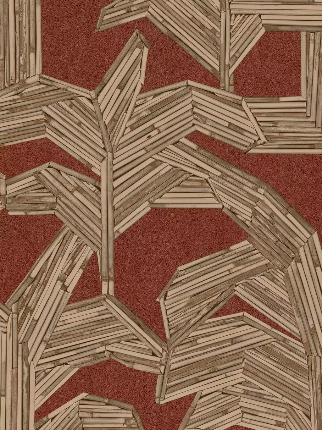 Der warme, erdige Rotton bildet die perfekte Basis für das kontrastreiche Muster in Naturtönen und erzeugt eine luxuriöse, aber dennoch organische Atmosphäre. Besonders in Kombination mit Holzmöbeln, warmen Stoffen und natürlichen Materialien entfaltet diese Tapete ihre volle Wirkung – ideal für stilvolle Wohn- oder Gastronomiekonzepte mit exotischem Charme.