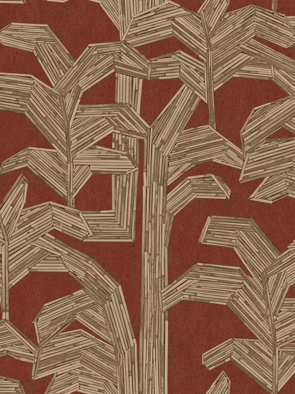 Der warme, erdige Rotton bildet die perfekte Basis für das kontrastreiche Muster in Naturtönen und erzeugt eine luxuriöse, aber dennoch organische Atmosphäre. Besonders in Kombination mit Holzmöbeln, warmen Stoffen und natürlichen Materialien entfaltet diese Tapete ihre volle Wirkung – ideal für stilvolle Wohn- oder Gastronomiekonzepte mit exotischem Charme.
