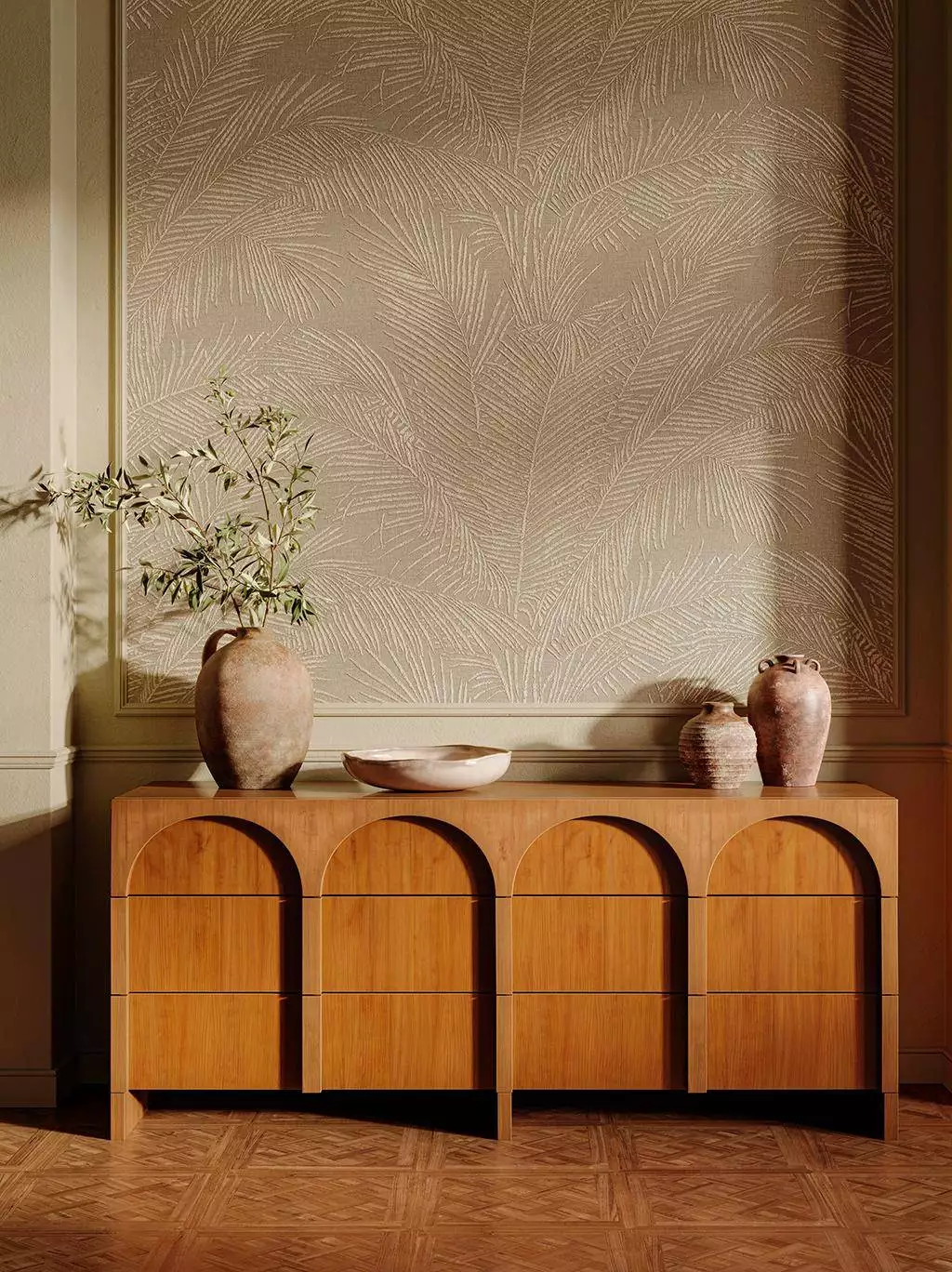 Die Tapete "Lanai Maui, col. 03" besticht durch ihr sanftes, organisches Muster, das an elegante Palmenblätter erinnert. Die dezente beige Farbgebung mit strukturierter, leicht glänzender Prägung verleiht ihr eine zeitlose, edle Ausstrahlung. Sie bringt eine natürliche Leichtigkeit in den Raum und passt besonders gut zu warmen Holztönen, sanften Erdtönen und natürlichen Materialien wie Leinen oder Keramik.