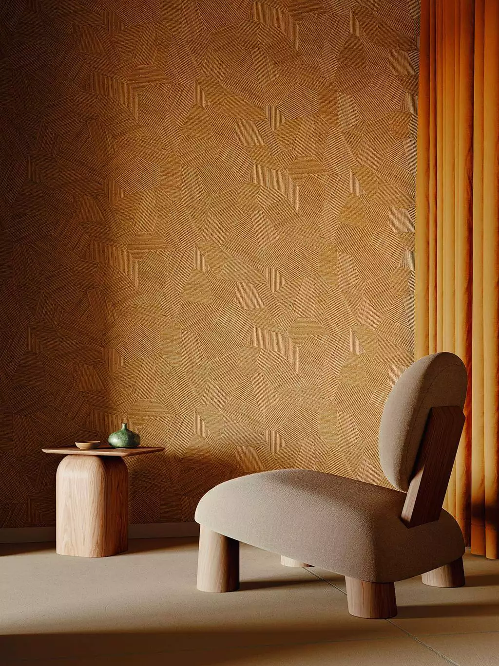 Die Tapete "Lanai Mauna, col. 10" beeindruckt mit einer warmen, erdigen Farbpalette und einer faszinierenden geometrischen Struktur. Die reliefartige Oberfläche mit feinen, linienartigen Prägungen erzeugt ein raffiniertes Spiel aus Licht und Schatten, das dem Raum Tiefe und eine natürliche Eleganz verleiht.