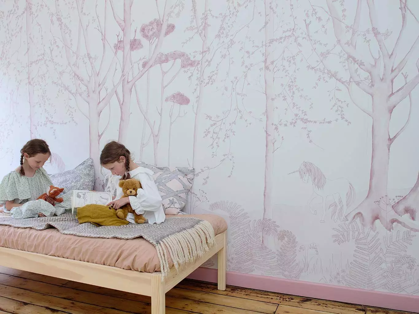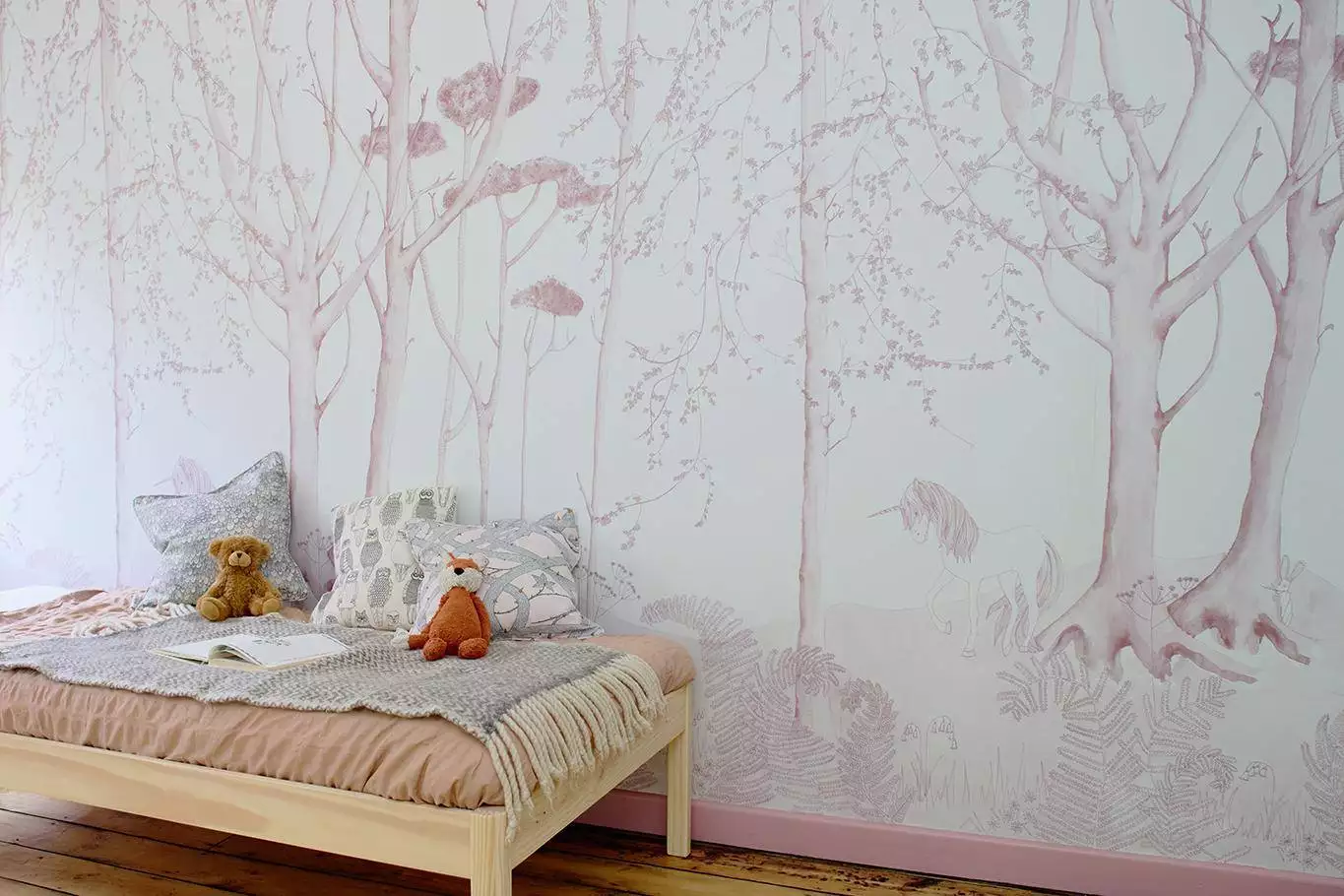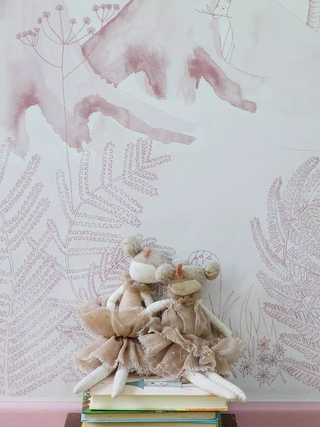„Legend“ von Abigail Edwards ist eine zart illustrierte Tapete, fast wie eine Szene aus einem Bilderbuch. Mit feinen Aquarellverläufen und einem Hauch handgemalter Imperfektion bringt sie eine poetische Waldszenerie an die Wand. Die Tapete erweckt dank Verschmierungen, Pinselstrichen und Bleistiftlinien den Eindruck, der Märchenwald sei direkt auf die Wand gezeichnet. Das Motiv zeigt Buchen, Farne, Glockenblumen und kleine Waldbewohner in sanften Farben – natürlich, ruhig und zeitlos - und fügt sich harmonisch in stilvolle Kinderzimmer oder ruhige Familienräume ein. Ein stilles, kunstvolles Design, das Raum für Fantasie lässt und auch erwachsene Ästhetik anspricht.