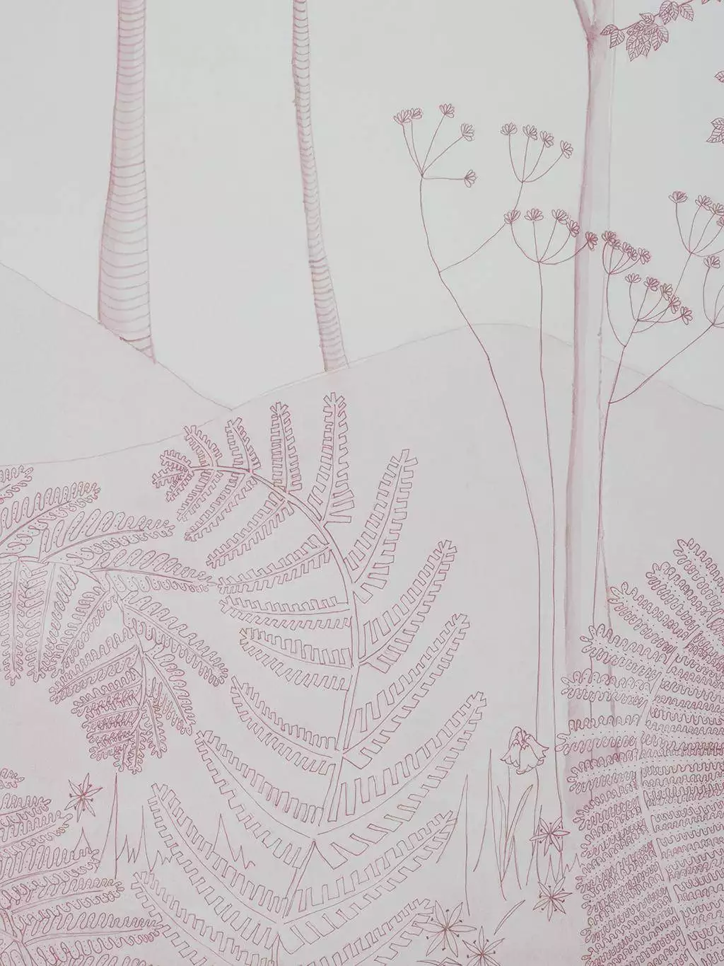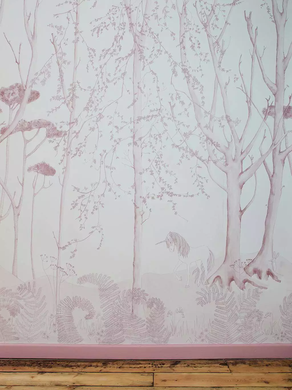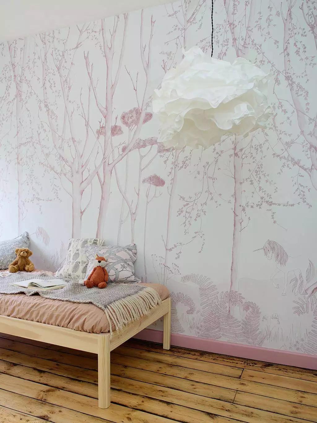 „Legend“ von Abigail Edwards ist eine zart illustrierte Tapete, fast wie eine Szene aus einem Bilderbuch. Mit feinen Aquarellverläufen und einem Hauch handgemalter Imperfektion bringt sie eine poetische Waldszenerie an die Wand. Die Tapete erweckt dank Verschmierungen, Pinselstrichen und Bleistiftlinien den Eindruck, der Märchenwald sei direkt auf die Wand gezeichnet. Das Motiv zeigt Buchen, Farne, Glockenblumen und kleine Waldbewohner in sanften Farben – natürlich, ruhig und zeitlos - und fügt sich harmonisch in stilvolle Kinderzimmer oder ruhige Familienräume ein. Ein stilles, kunstvolles Design, das Raum für Fantasie lässt und auch erwachsene Ästhetik anspricht.