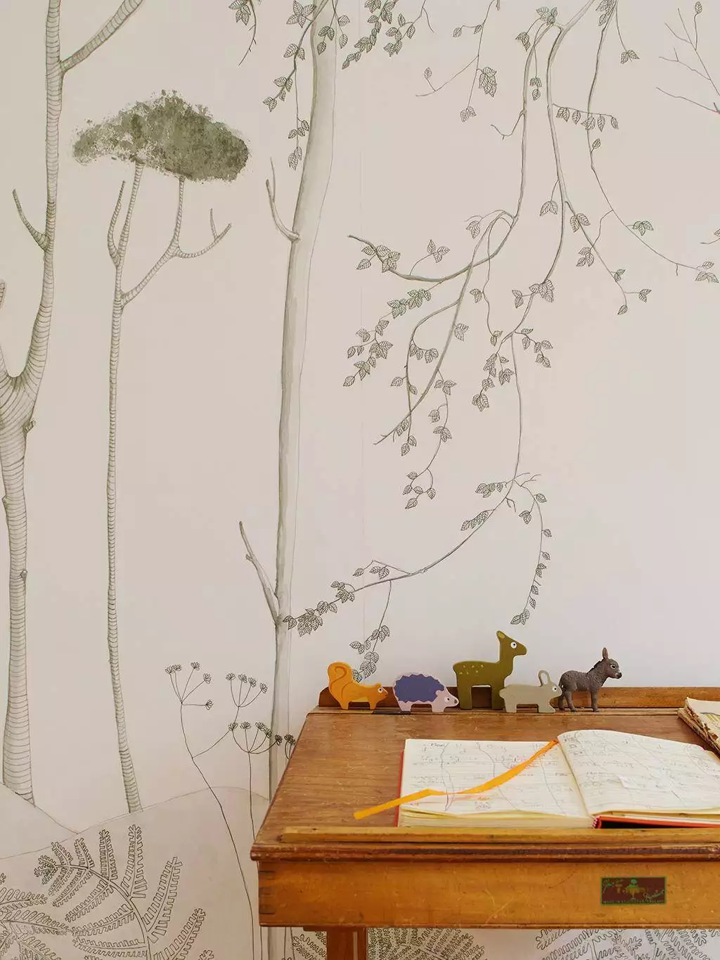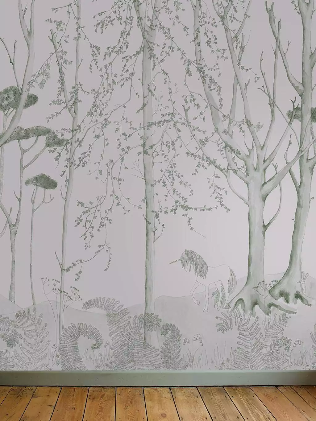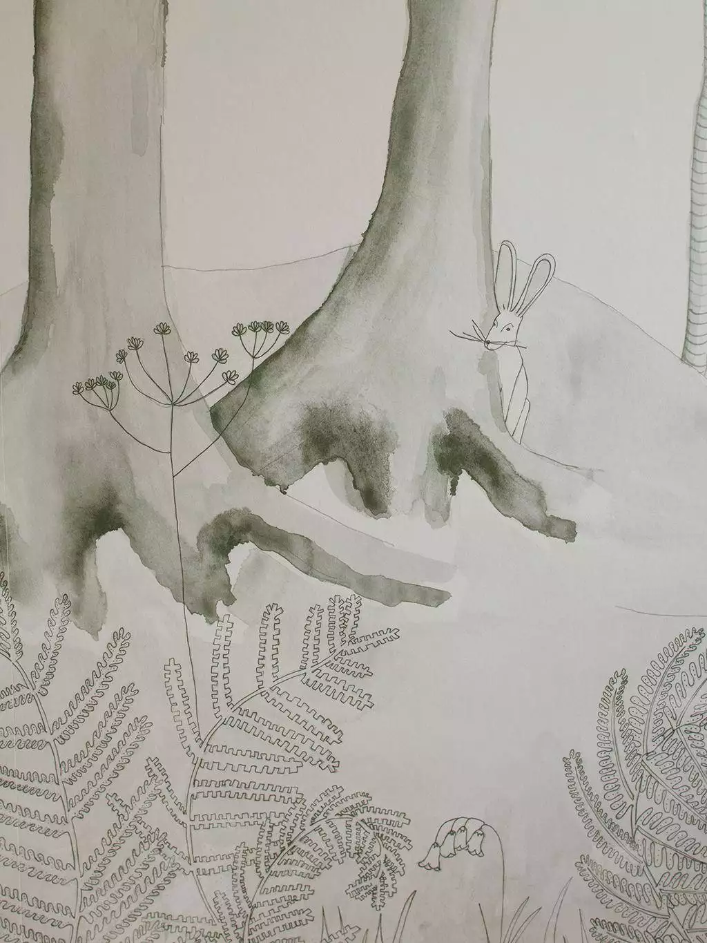 „Legend“ von Abigail Ewards ist eine zart illustrierte Tapete, die wie eine Szene aus einem Bilderbuch wirkt. Mit feinen Aquarellverläufen und einem Hauch handgemalter Imperfektion - Verschmierungen, Pinselstriche und Bleistiftlinien sind noch zu erkennen - bringt sie eine poetische Waldszenerie an die Wand. Die Tapete lässt den Entstehungsprozess des Designs erkennen und den Eindruck entstehen, das Motiv sei direkt auf die Wand gezeichnet worden. Das Motiv zeigt Buchen, Farne, Glockenblumen und kleine Waldbewohner in sanften Farben – natürlich, ruhig und zeitlos - und fügt sich harmonisch in stilvolle Kinderzimmer oder ruhige Familienräume ein. Ein stilles, kunstvolles Design, das Raum für Fantasie lässt, aber auch erwachsene Ästhetik anspricht.