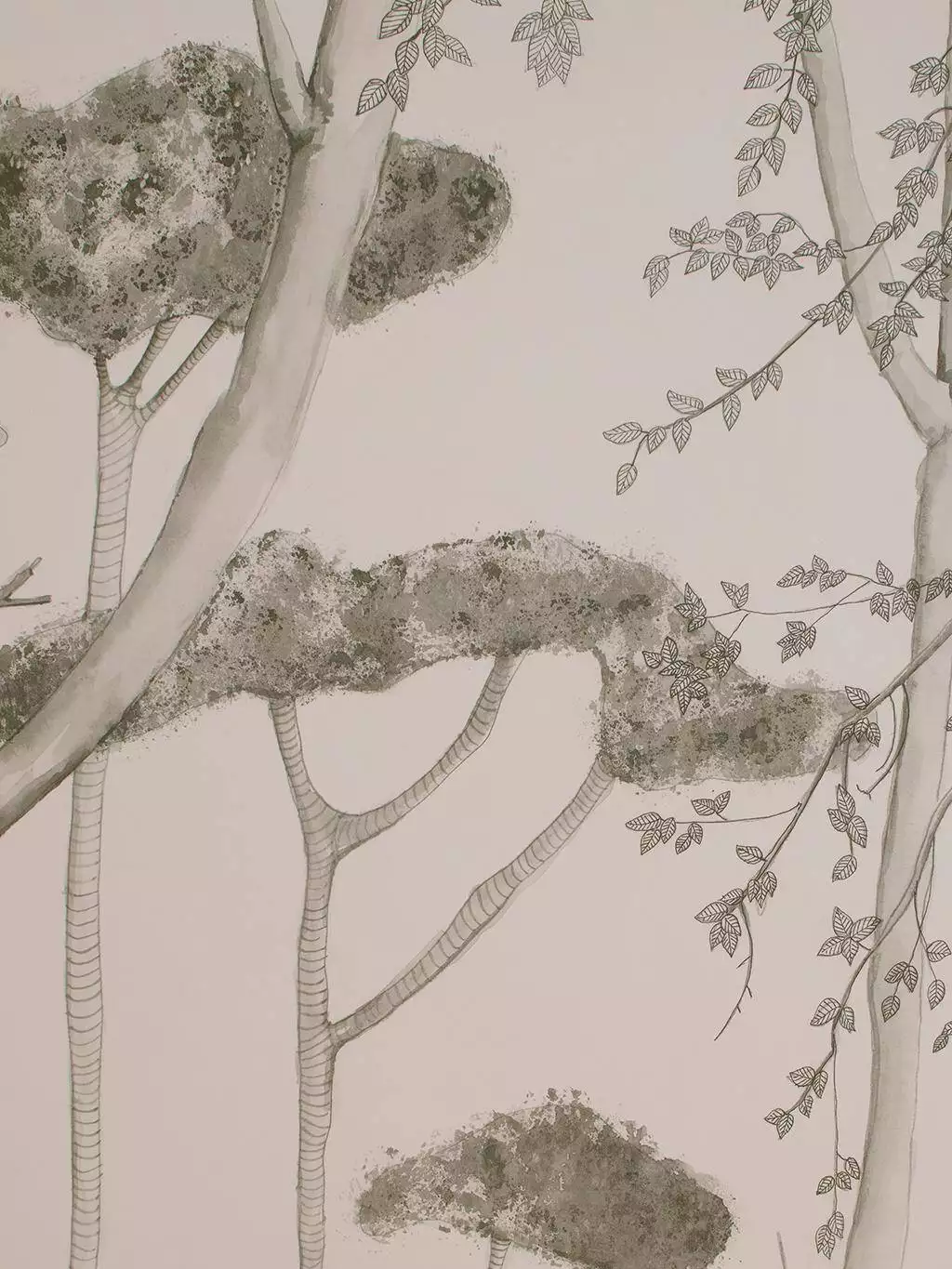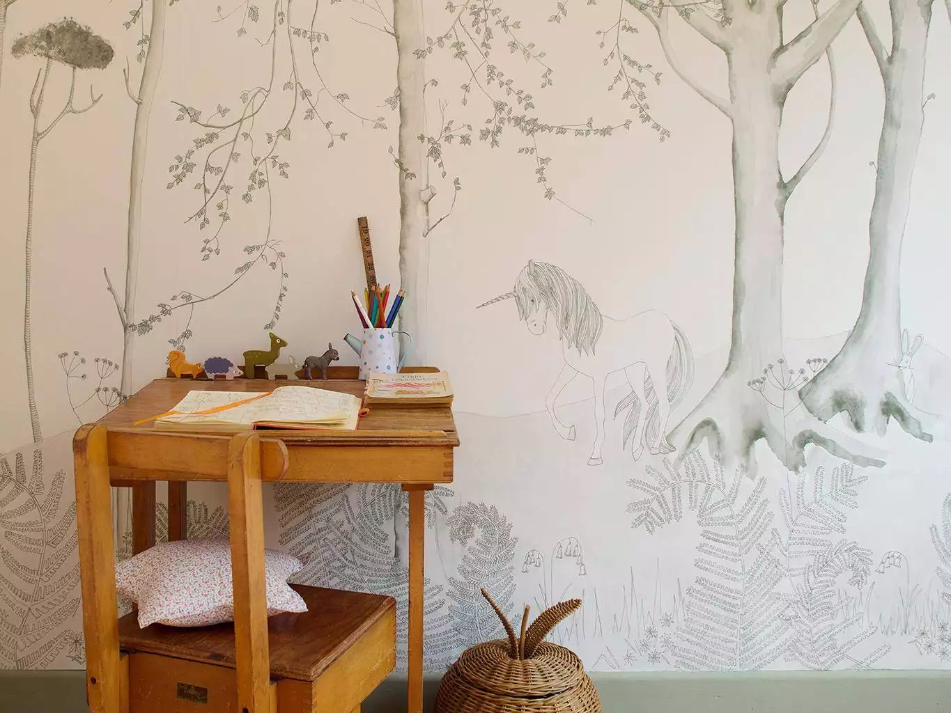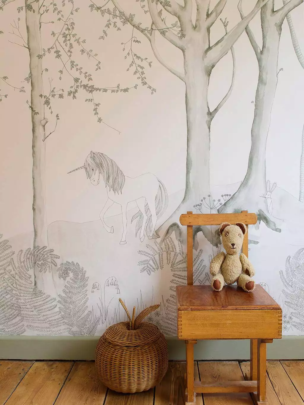 „Legend“ von Abigail Ewards ist eine zart illustrierte Tapete, die wie eine Szene aus einem Bilderbuch wirkt. Mit feinen Aquarellverläufen und einem Hauch handgemalter Imperfektion - Verschmierungen, Pinselstriche und Bleistiftlinien sind noch zu erkennen - bringt sie eine poetische Waldszenerie an die Wand. Die Tapete lässt den Entstehungsprozess des Designs erkennen und den Eindruck entstehen, das Motiv sei direkt auf die Wand gezeichnet worden. Das Motiv zeigt Buchen, Farne, Glockenblumen und kleine Waldbewohner in sanften Farben – natürlich, ruhig und zeitlos - und fügt sich harmonisch in stilvolle Kinderzimmer oder ruhige Familienräume ein. Ein stilles, kunstvolles Design, das Raum für Fantasie lässt, aber auch erwachsene Ästhetik anspricht.