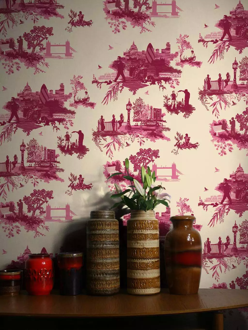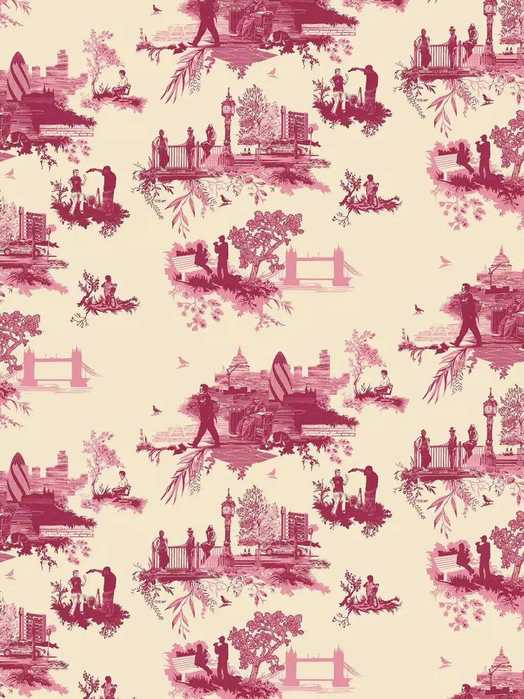 London Toile Wallpaper von Timorous Beasties in red & pink on cream zeigt ein Stück Großstadtpoesie für die Wand: Diese elegante Tapete erzählt Londons Geschichten zwischen Tradition und Aufbruch. Zwischen Tower Bridge und Gherkin flanieren Menschen, träumen, leben – ein modernes Märchen in Tinte und Struktur. Das klassische Toile-de-Jouy-Muster erhält einen urbanen Rhythmus, der Nostalgie mit Ironie verbindet. Für Räume mit Persönlichkeit und einem künstlerischen Twist.