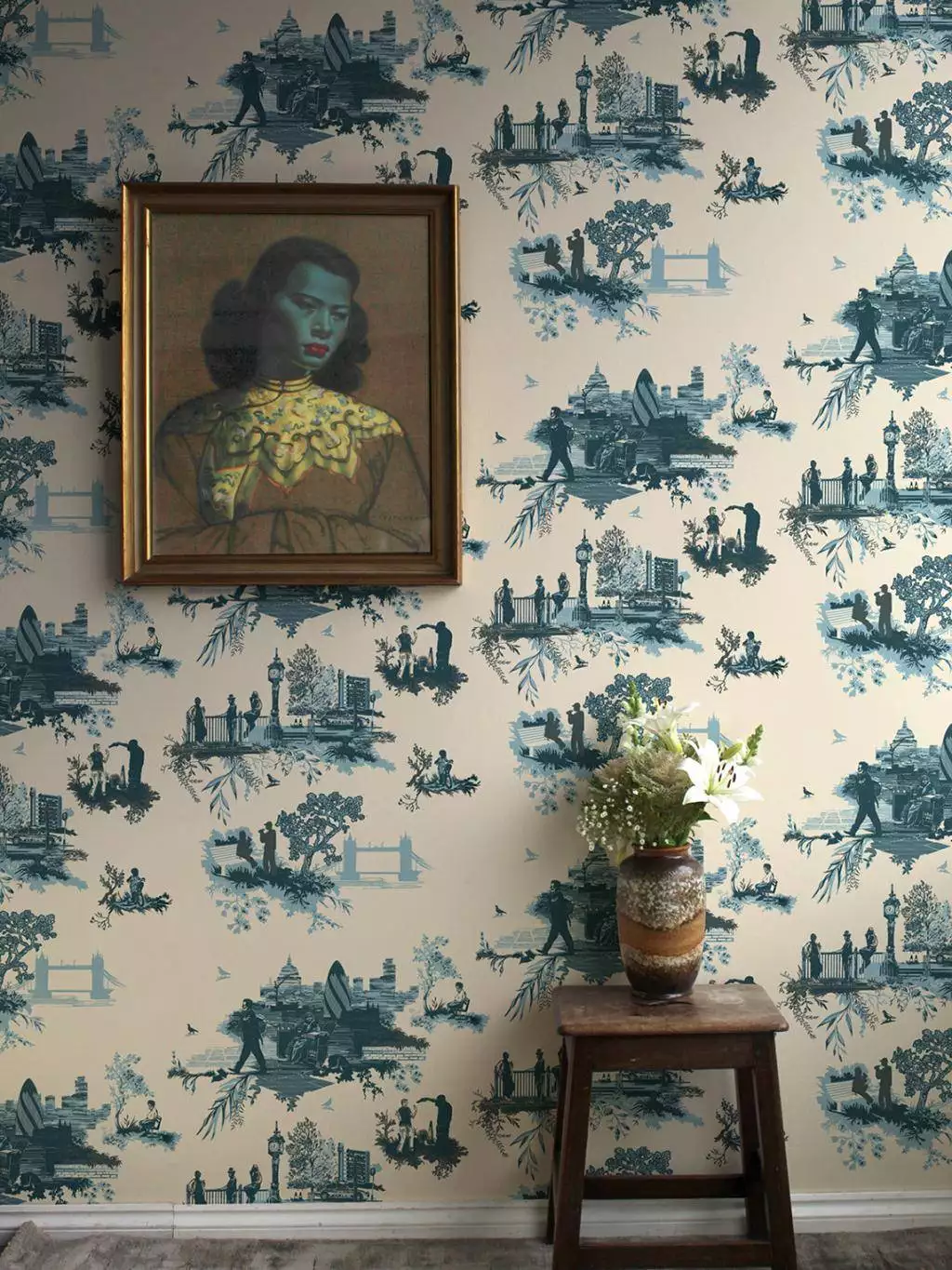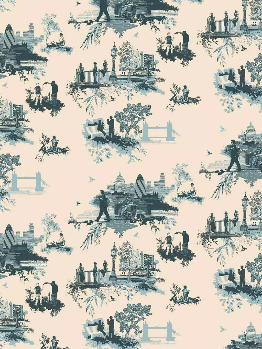 Die Tapete London Toile Blues on Cream bringt einen Hauch London in den Raum - neu interpretiert. Mühelos schafft die Komposition aus klassischem Toile-de-Jouy und urbanen Szenen auf elegante Weise eine subtile Spannung zwischen Geschichte und Gegenwart. In kühlen Blautönen wirkt das Muster ruhig und kultiviert – wie eine Erinnerung an Stadtspaziergänge im Morgendunst.