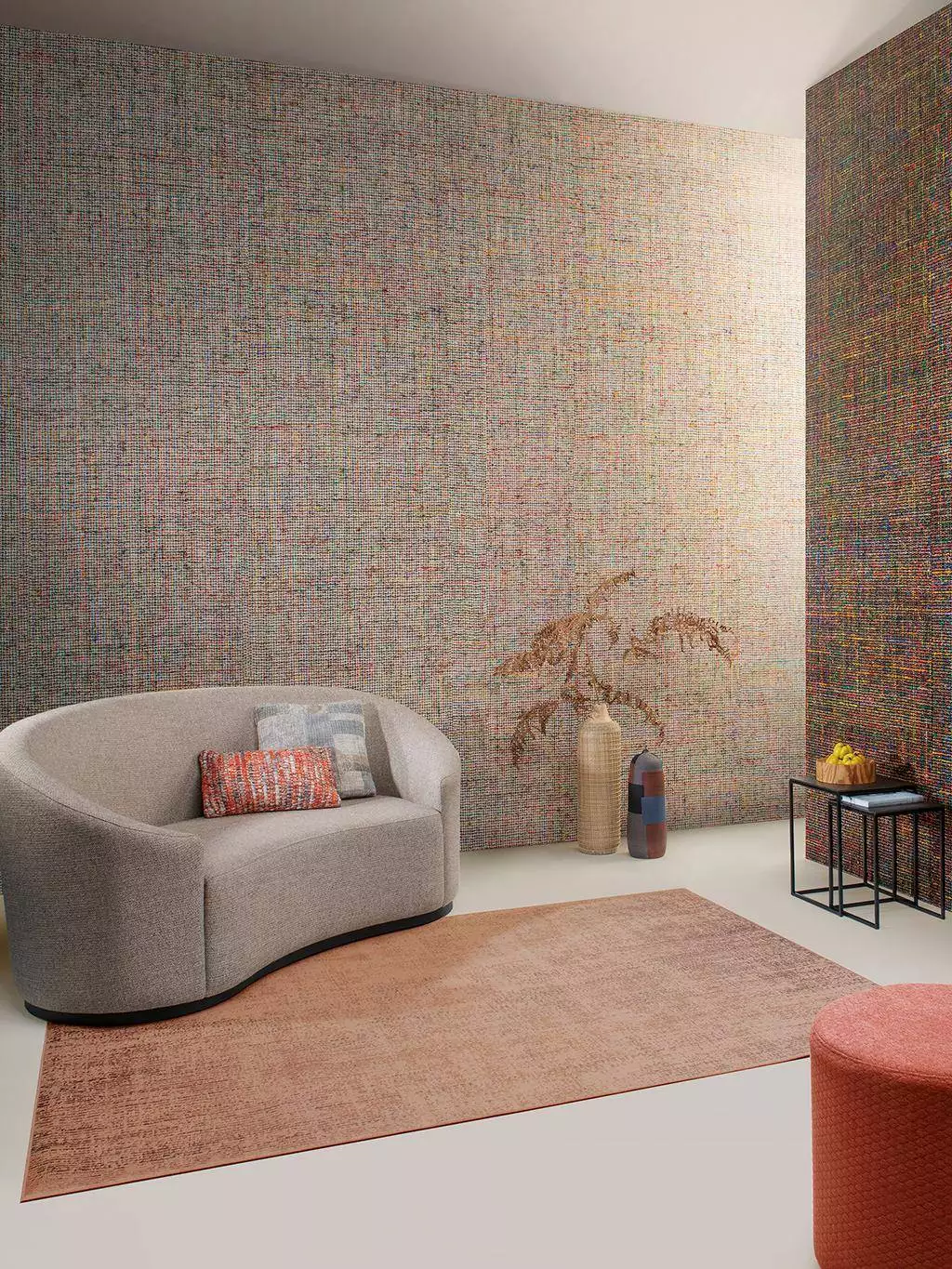 Mademoiselle Tweed, col. 31 ist eine Hommage an die klassische Eleganz von Tweed – neu interpretiert für die Wand. Handgesponnene, grobe Garne werden kunstvoll verwebt und auf Vlies kaschiert, wodurch eine haptische Oberfläche mit einzigartiger Struktur entsteht. Die farbenfrohen, locker versponnenen Fäden in Rot, Blau, Grün und Gelb verleihen dem Design eine verspielte Lebendigkeit, die an Haute Couture erinnert. Diese Tapete bringt Wärme und Charakter in den Raum und verbindet textile Handwerkskunst mit modernem Wohnstil.