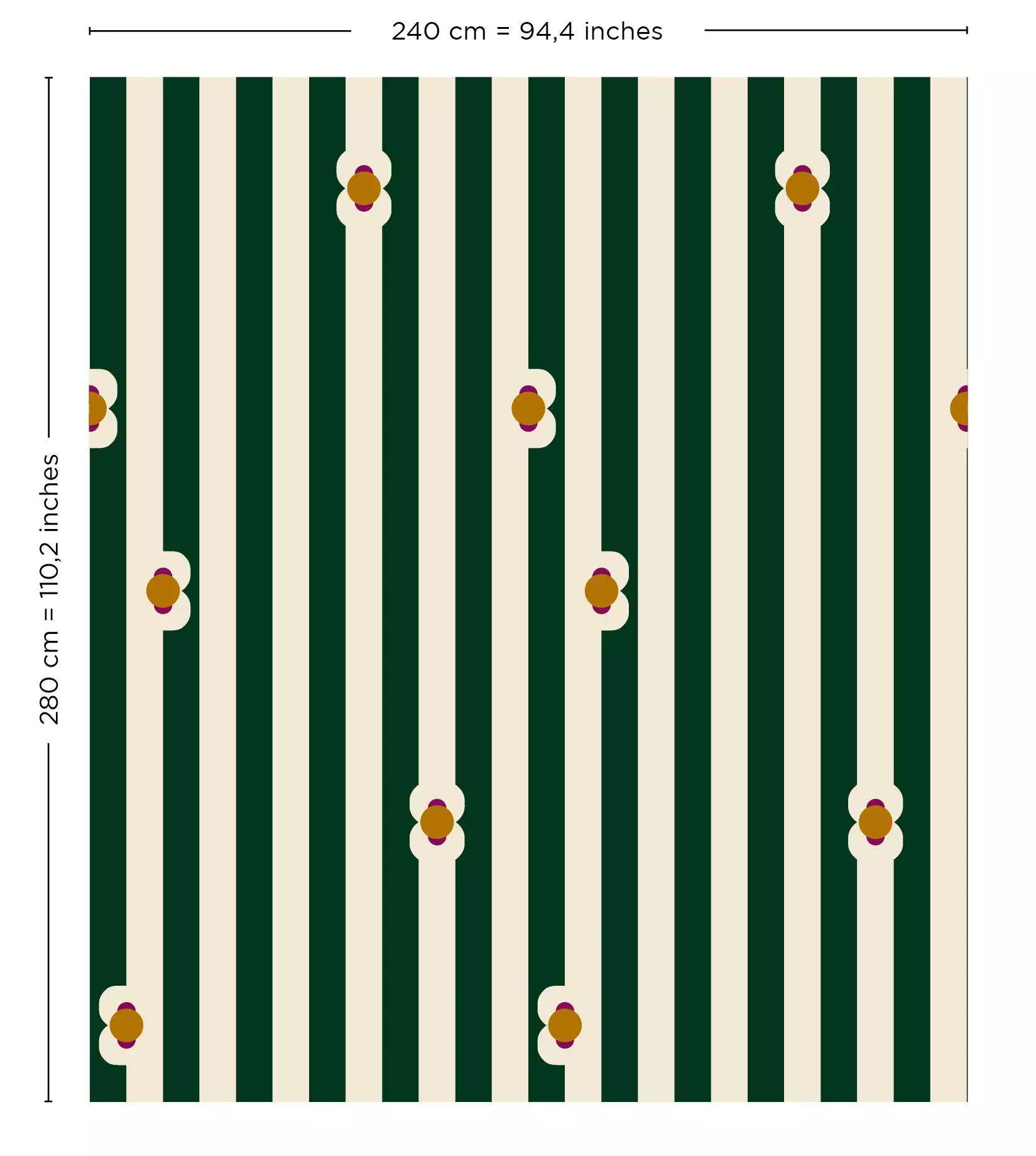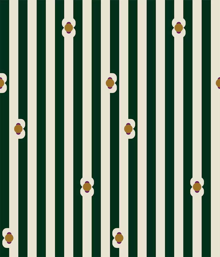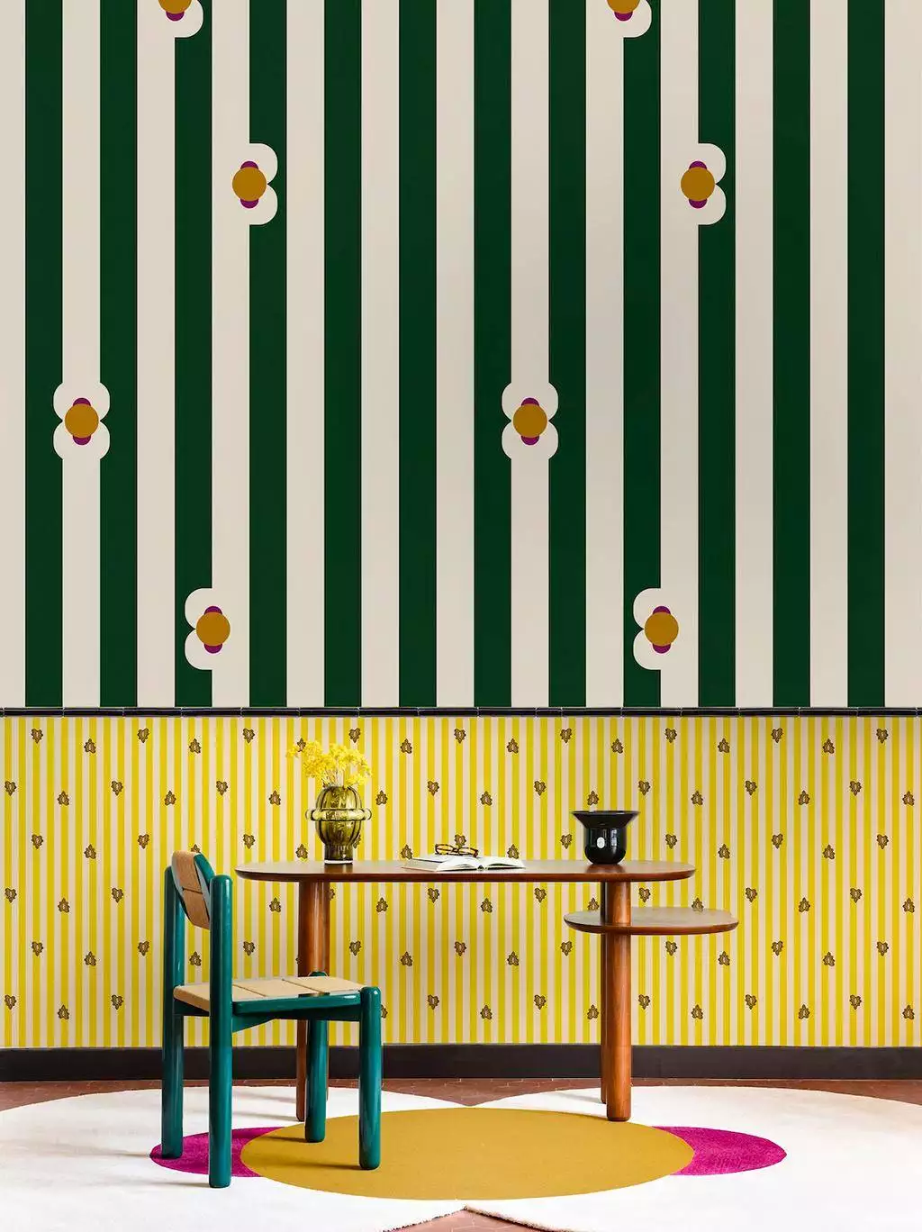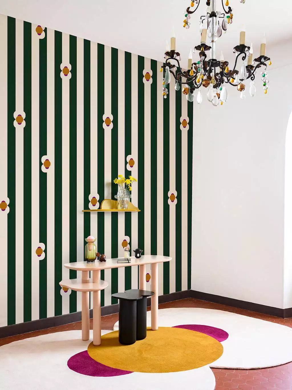 Das Design Maioun von Bien Fait geht Hand in Hand mit dem Motiv Longo Mai. Beide Raumdesigns stammen von der Künstlerin Margaux Keller, die sich zu ihnen vom Duft der Provence inspirieren ließ. Die Tapeten setzen mit kräftigen Farbtönen, abstrahiertem Blumendesign und auffälligen Streifen auf Großzügigkeit - hier in kräftigem Grün.