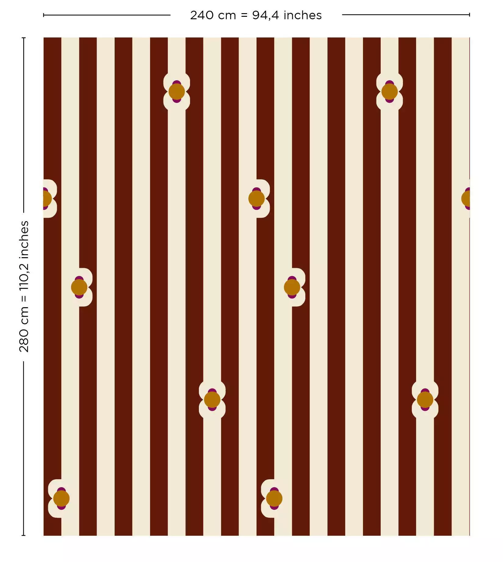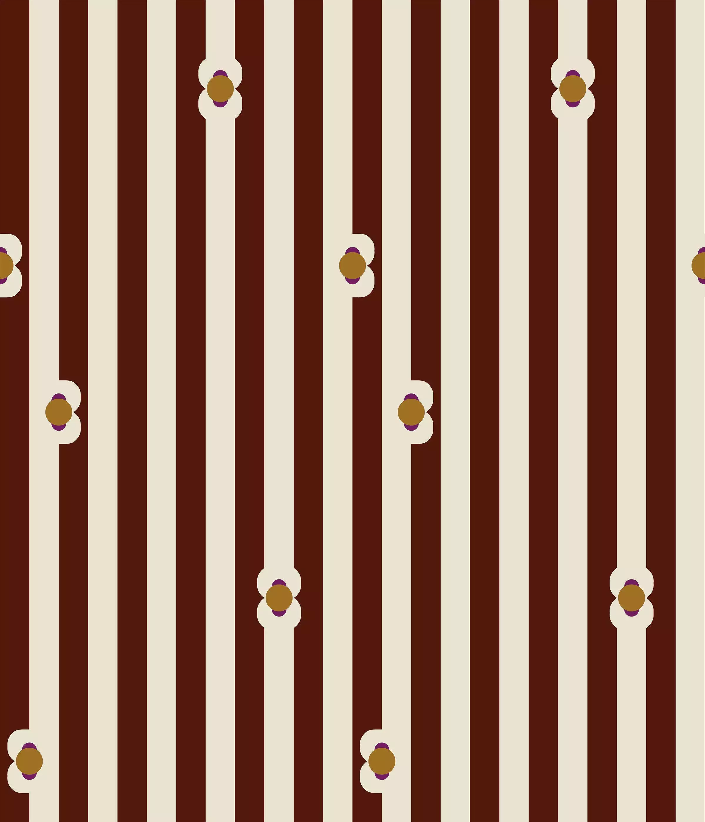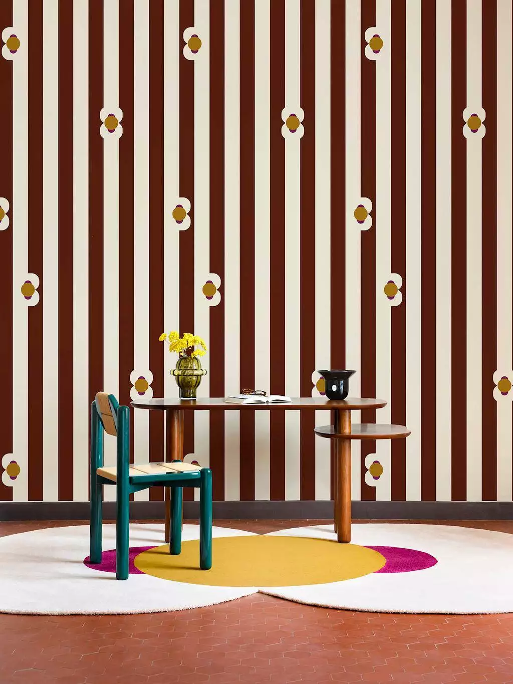 Das Design Maioun von Bien Fait geht Hand in Hand mit dem Motiv Longo Mai. Beide Raumdesigns stammen von der Künstlerin Margaux Keller, die sich zu ihnen vom Duft der Provence inspirieren ließ. Die Tapeten setzen mit kräftigen Farbtönen, abstrahiertem Blumendesign und auffälligen Streifen auf Großzügigkeit - hier in kräftigem Braun mit Creme.