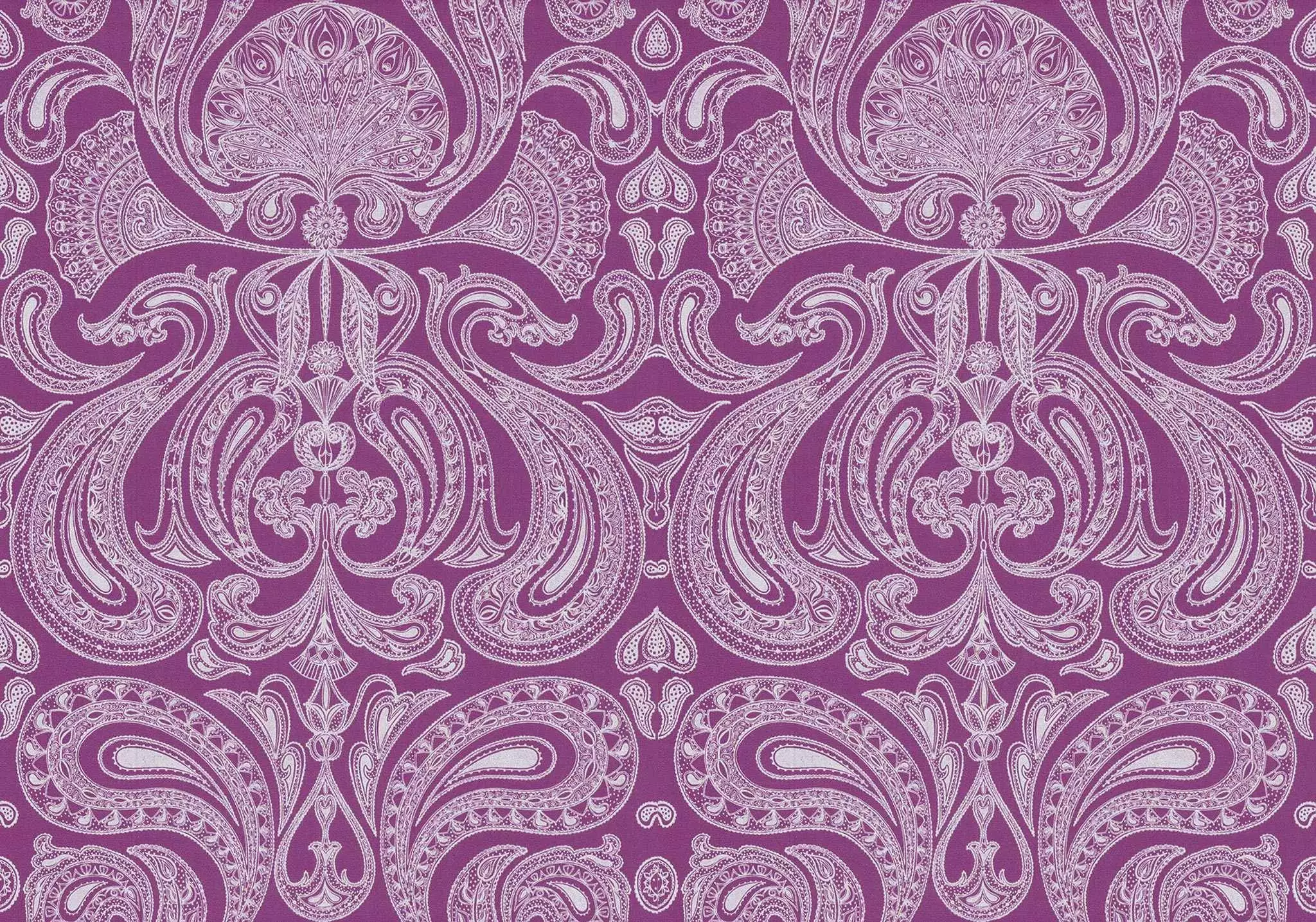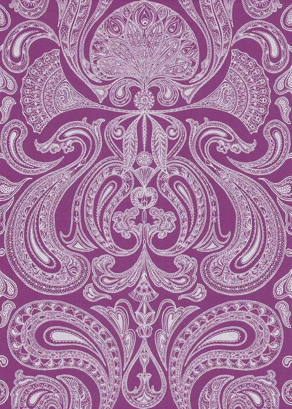 Malabar ist ein auffälliger, großflächiger Paisleydruck, der mit seinen wirbelnden Linien und Formen an die Psychedelik der 1960er Jahre erinnert. Das Muster ist Grau auf Lila.
