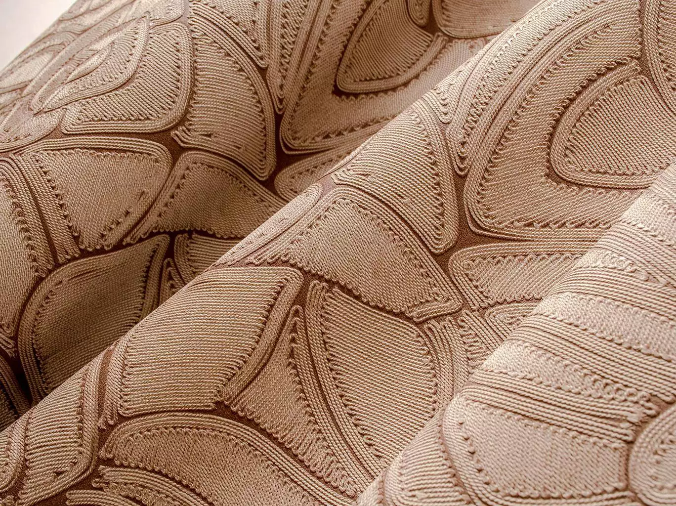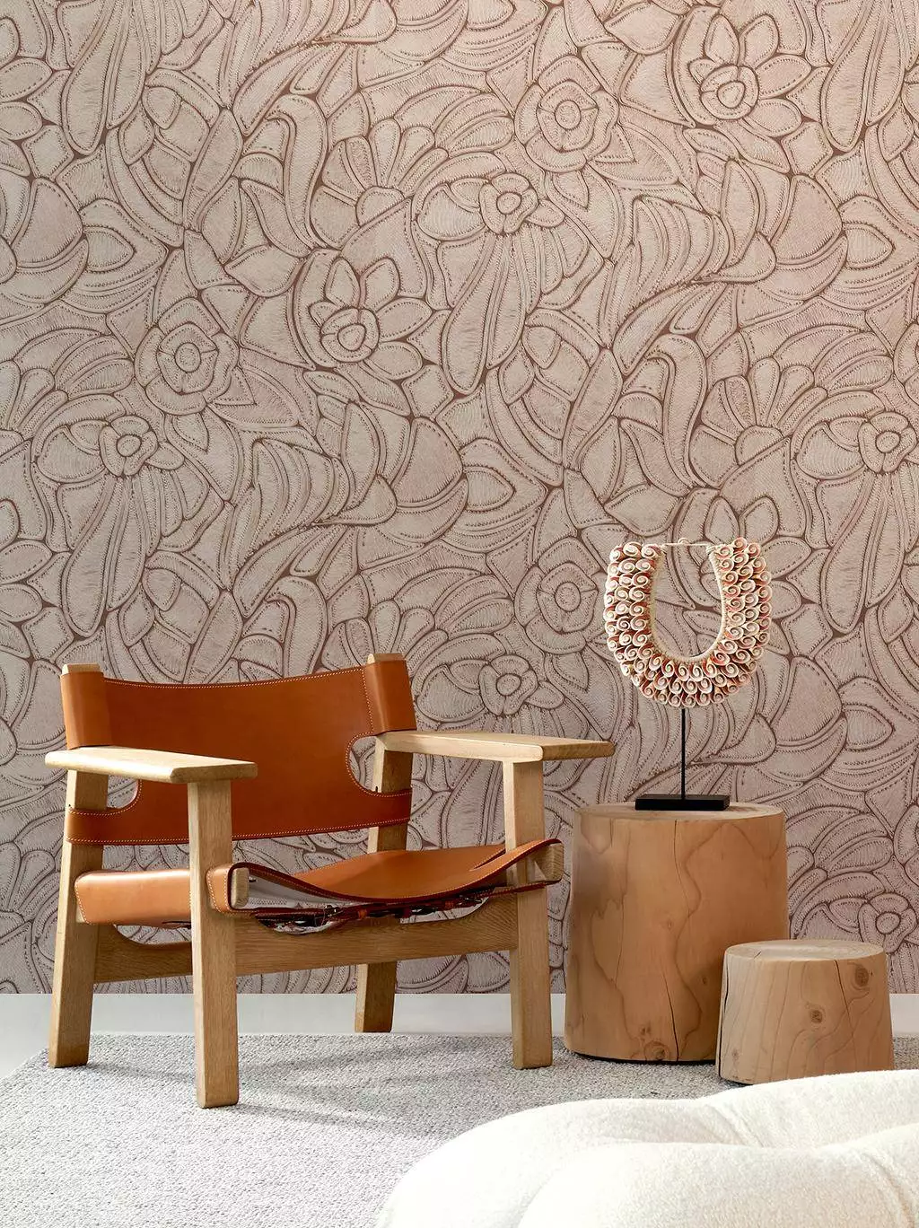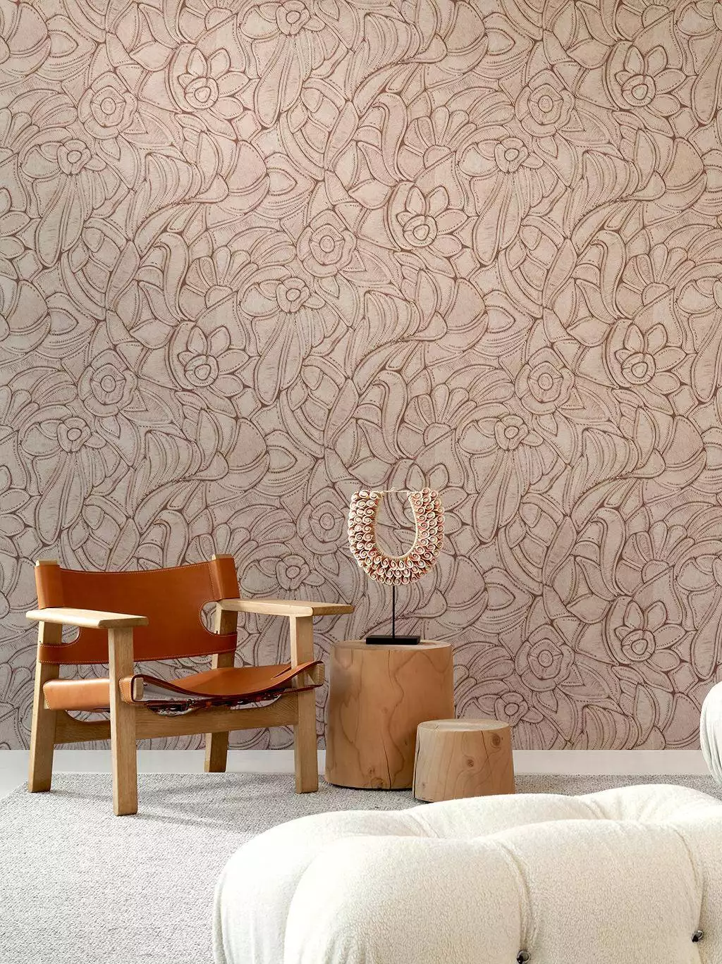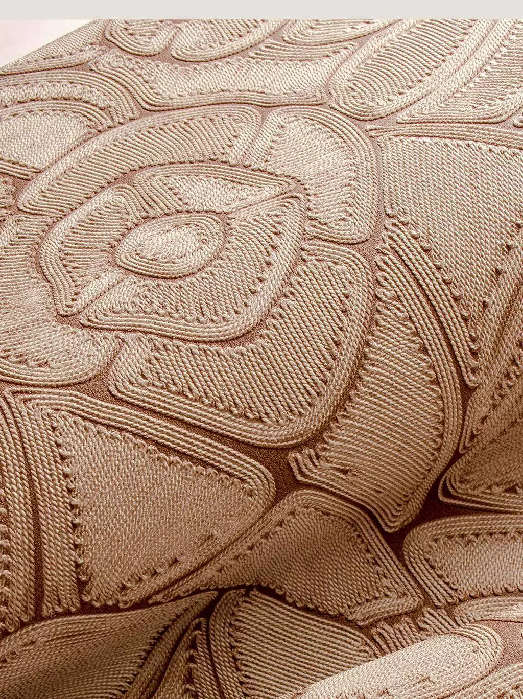 Die Tapete Manila Flore, col. 02 bringt kunstvolle Handwerkskunst in den Wohnraum. Ihr florales Muster basiert auf handgelegten Seilen unterschiedlicher Materialien und Stärken, die ein filigranes Relief bilden. Diese feine Struktur wurde als hochwertige Vinyltapete umgesetzt und verleiht der Wand eine elegante, taktile Tiefe.