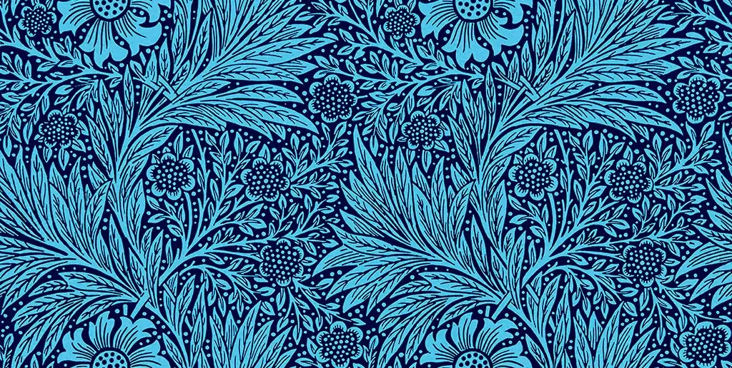 Die "Marigold"-Tapete von William Morris ist in drei verschiedenen Farbvarianten erhältlich. Diese Variante in der Farbe "navy" ist ein leuchtendes Statement Piece. Die Tapete stammt aus der Ben Pentreath Kollektion, die sich durch ihre neu gestalteten Farbgebungen auszeichnet.