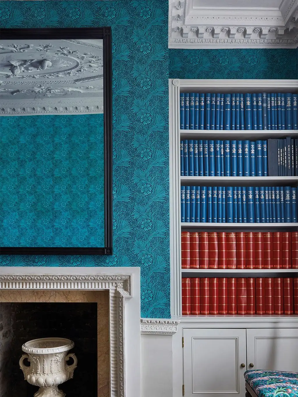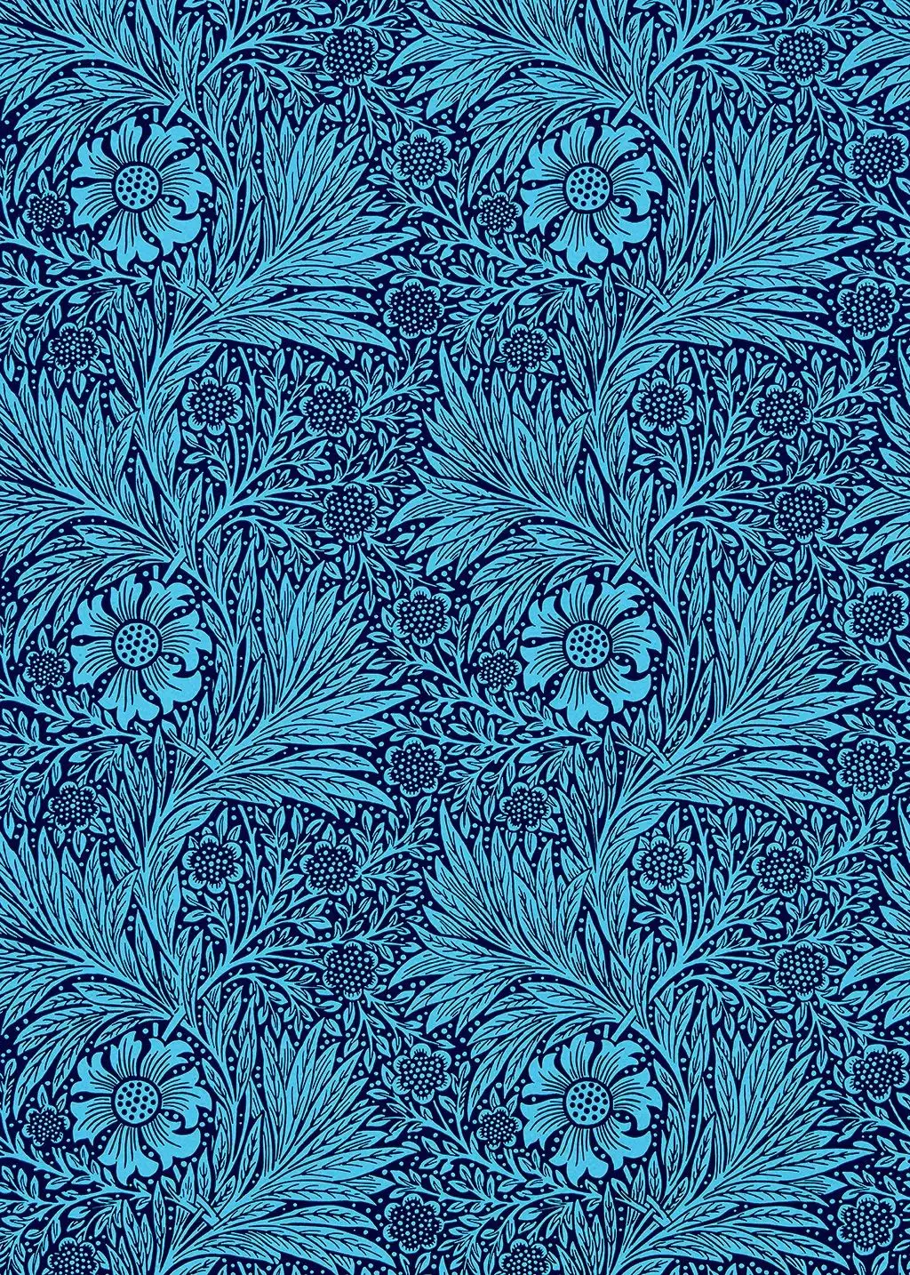 Die "Marigold"-Tapete von William Morris ist in drei verschiedenen Farbvarianten erhältlich. Diese Variante in der Farbe "navy" ist ein leuchtendes Statement Piece. Die Tapete stammt aus der Ben Pentreath Kollektion, die sich durch ihre neu gestalteten Farbgebungen auszeichnet.