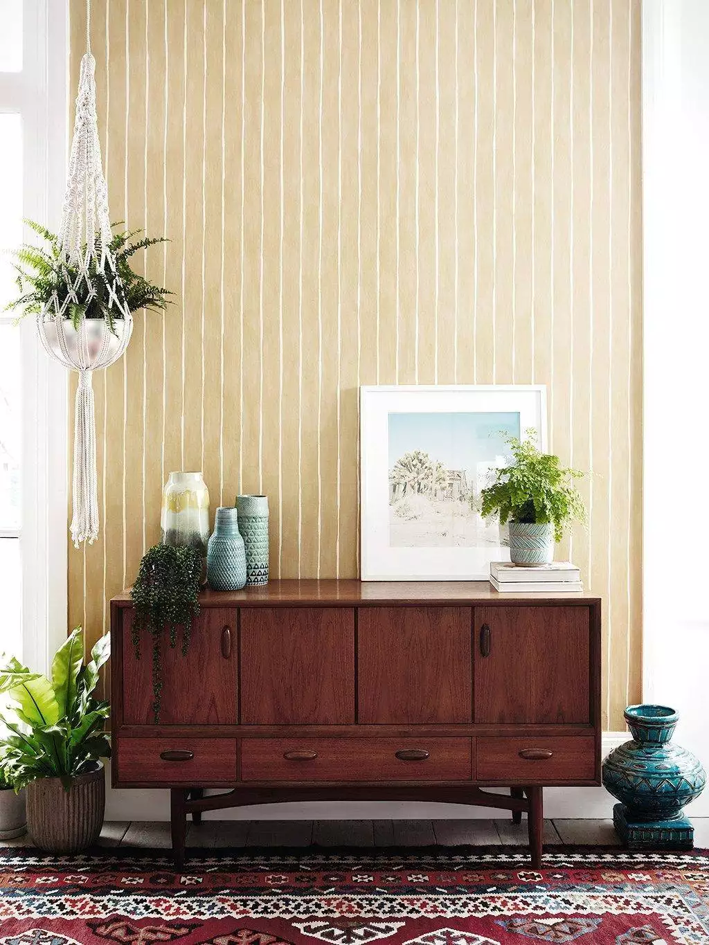 Marquee Stripe ist ein wunderschönes, handgezeichnetes Design, das von Töpferwaren inspiriert ist. Die Struktur erinnert an Ton und zeigt ockerfarbene Nuancen.