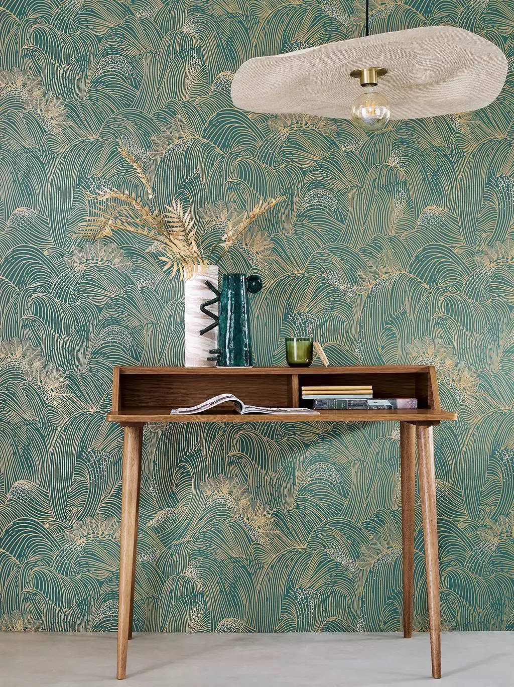 • Großformatige Muster, warme Farben und dezente Metallic-Effekte, die Tiefe und Eleganz schaffen