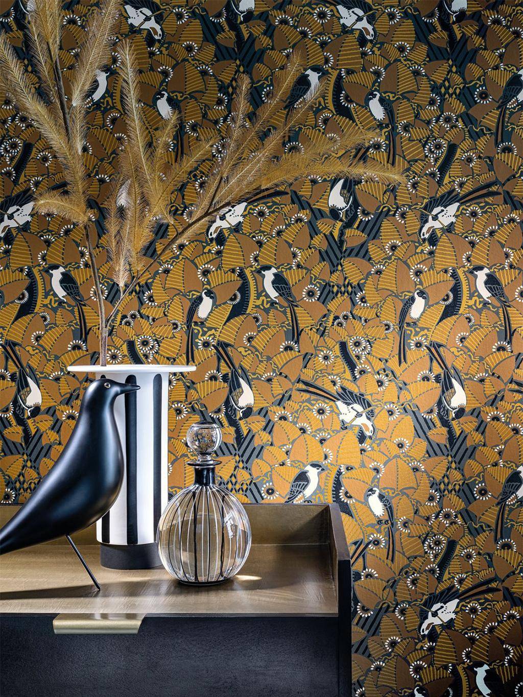 Das Majolikahaus und dessen blumige Fassade haben der Tapete Mayoliques ihren Stempel aufgedrückt. Das Majoliques-Design erinnert an den Stil der Wiener Secession. Design und Geometrie harmonieren bei dem Wirbel aus stilisierter Vegetation, in dem mattschwarze Farbe abstrahierte Vögel hervorhebt und die Metallic-Farbe die Leuchtkraft der kleinen Blumen verstärkt. Dieses Hauptdesign wurde mit 5 Folien erstellt, darunter eine mit Grit (mattschwarzer Sandfarbe) für den Hintergrund, und für bestimmte Details wurde eine Metallic-Farbe verwendet, deren Platzierung von Farbe zu Farbe variiert.