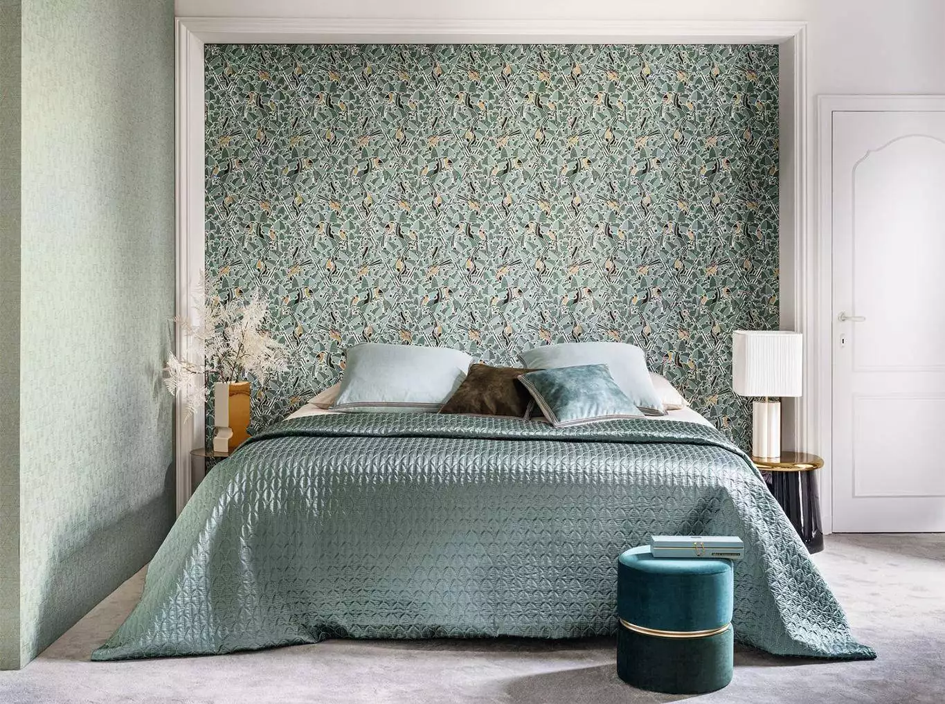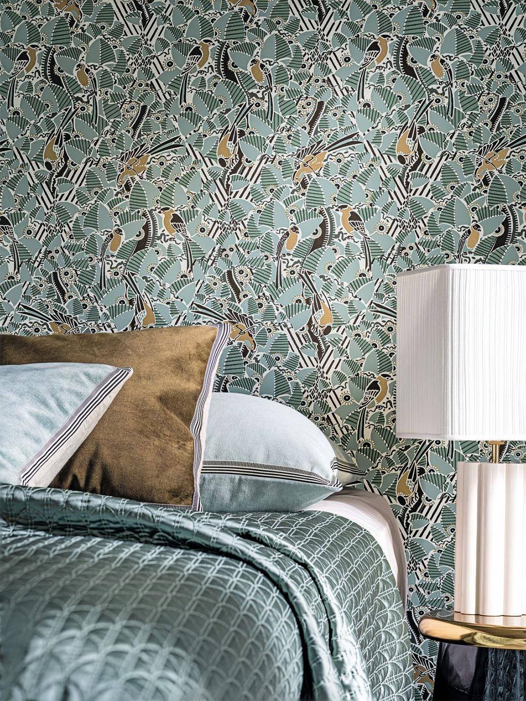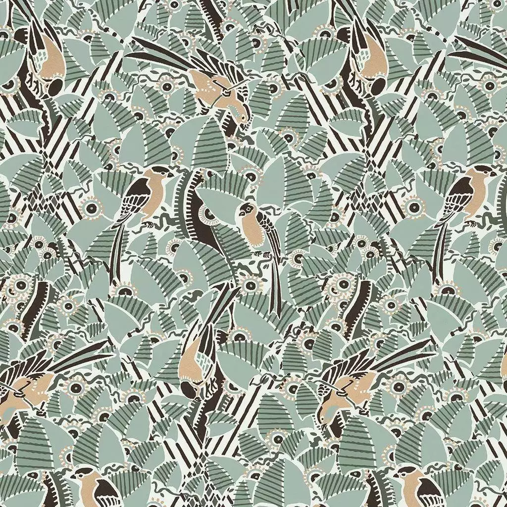 Das Majolikahaus und dessen blumige Fassade haben der Tapete Mayoliques ihren Stempel aufgedrückt. Das Design erinnert an den Stil der Wiener Secession. Harmonisch verschmelzen Design und Geometrie zu einem Wirbel aus stilisierter Vegetation, in dem mattes Schwarz abstrahierte Vögel hervorhebt und die Metallic-Farbe die Leuchtkraft kleinen Blumer verstärkt. Dieses Hauptdesign wurde mit 5 Folien erstellt, darunter eine mit Grit (mattschwarzer Sandfarbe) für den Hintergrund, und für bestimmte Details wurde eine Metallic-Farbe verwendet, deren Platzierung von Farbe zu Farbe variiert.