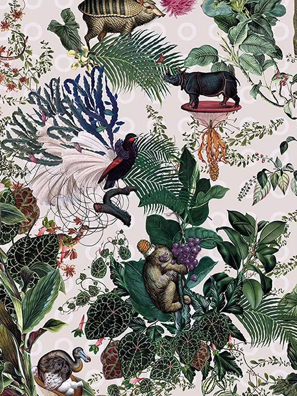 Mit der Tapete „Menagerie of Extinct Animals No2“ in Rosa schaffen Sie eine Atmosphäre voller Fantasie und Lebendigkeit.