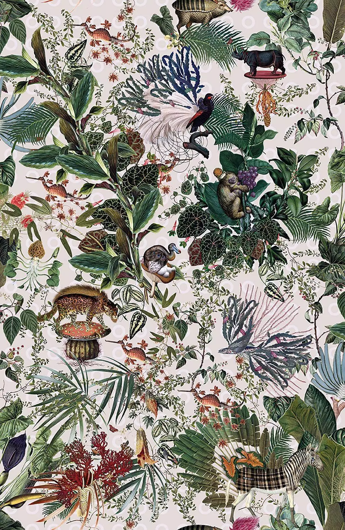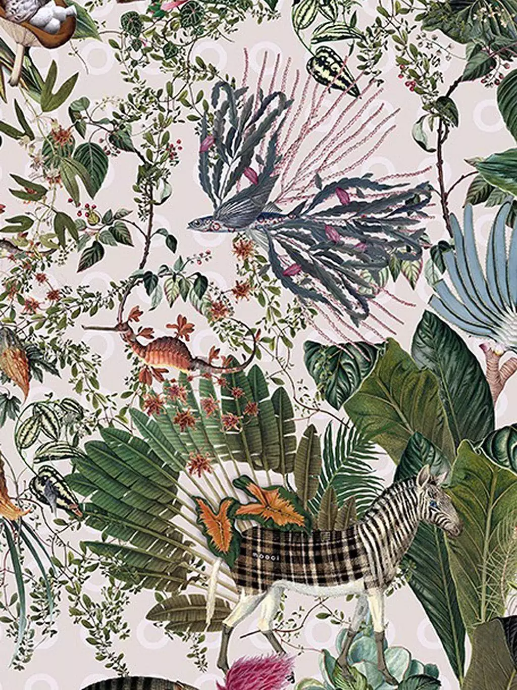 Inmitten üppiger, samtig grüner Dschungelpflanzen auf hellrosafarbenem Hintergrund tummeln sich zehn fantasievoll gestaltete Tiere, die auf kunstvolle Art und Weise Leben in Ihre vier Wände bringen.