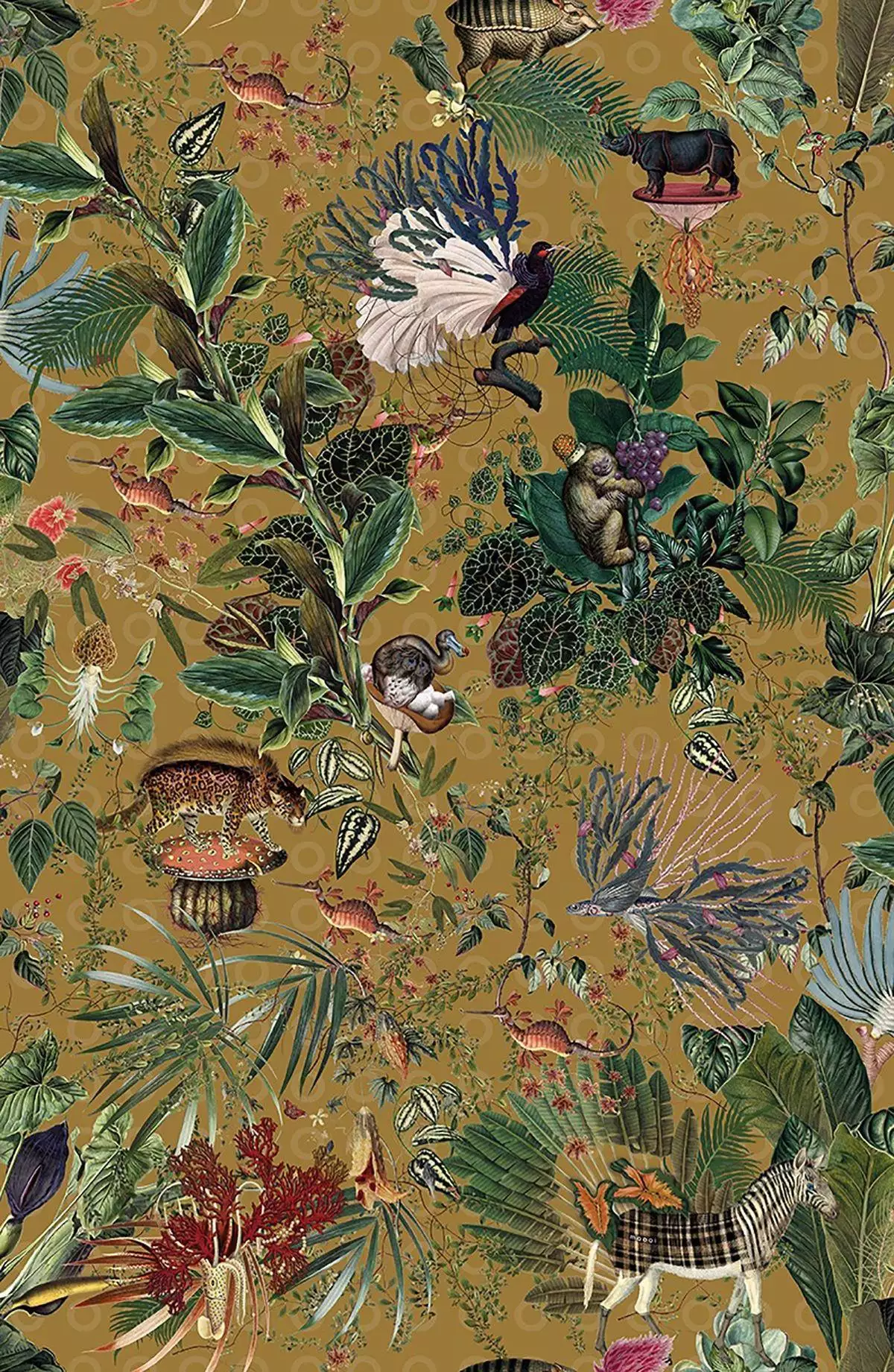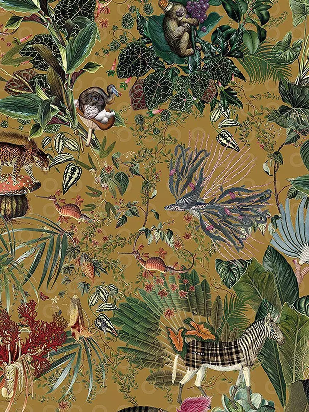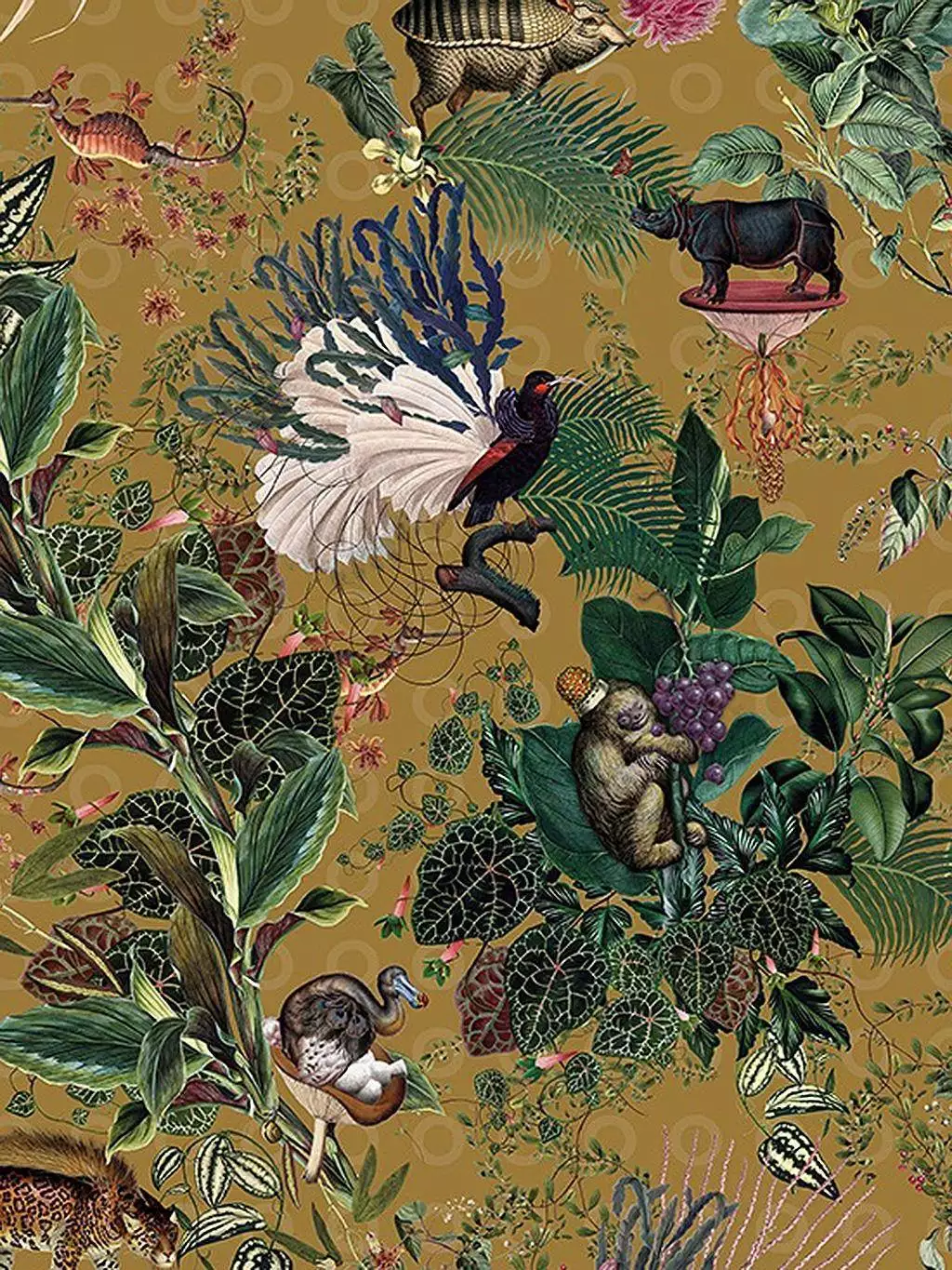 Inmitten üppiger, samtig grüner Dschungelpflanzen auf einem eleganten messingfarbenem Hintergrund tummeln sich zehn fantasievoll gestaltete Tiere, die den Betrachter in ihren Bann ziehen.
