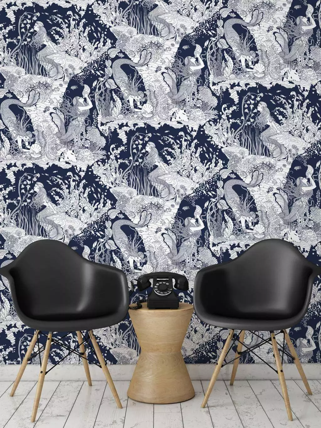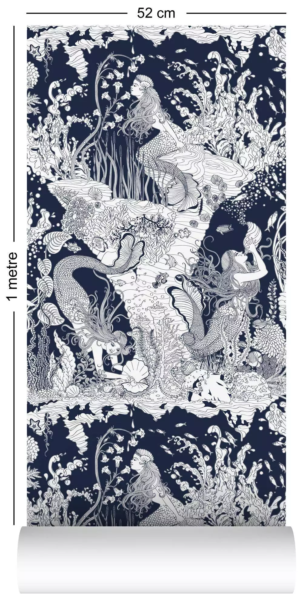 Die Tapete Mermaids zeigt ein traumhaft verspieltes Unterwasserszenario in einer harmonischen Farbpalette aus Tiefblau und feinem Weiß. Das Muster ist dicht und detailreich: Meerjungfrauen mit kunstvoll gezeichneten Haaren tummeln sich zwischen Seegras, Muscheln und Korallen. Die Szenerie wirkt wie aus einem viktorianischen Märchenbuch und verleiht dem Raum eine geheimnisvolle Tiefe – ideal für Badezimmer oder andere Rückzugsorte. Ein Design, das sowohl romantisch als auch fantastisch ist.
