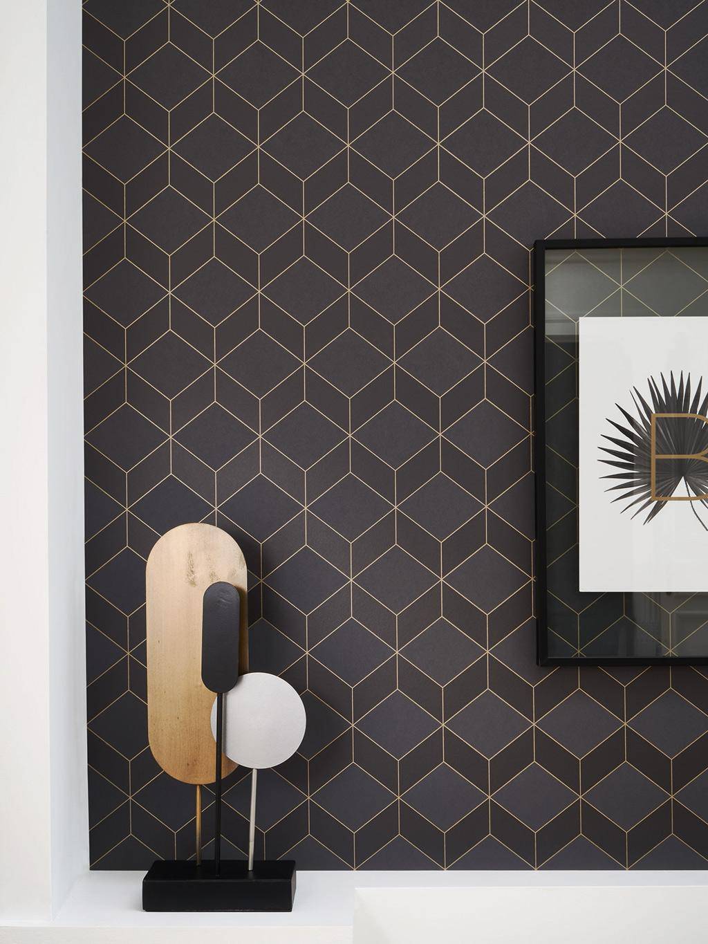 Die Art-Déco-Tapete Metro Noir setzt auf Geometrie: klaren Formen, matte Flächen und feine Metallik-Effekte. Goldene Linien betonen zart die Art-Déco-typischen Elemente und erzeugen gemeinsam mit den wechselnden Oberflächen einen dreidimensionalen Effekt. Modern greifen Schwarz und Gold als ein harmonisches Farbschema den charakteristischen Stil der 1920er aufgreift. Ideal für Wohn- und Arbeitsbereiche mit architektonischer Klarheit.