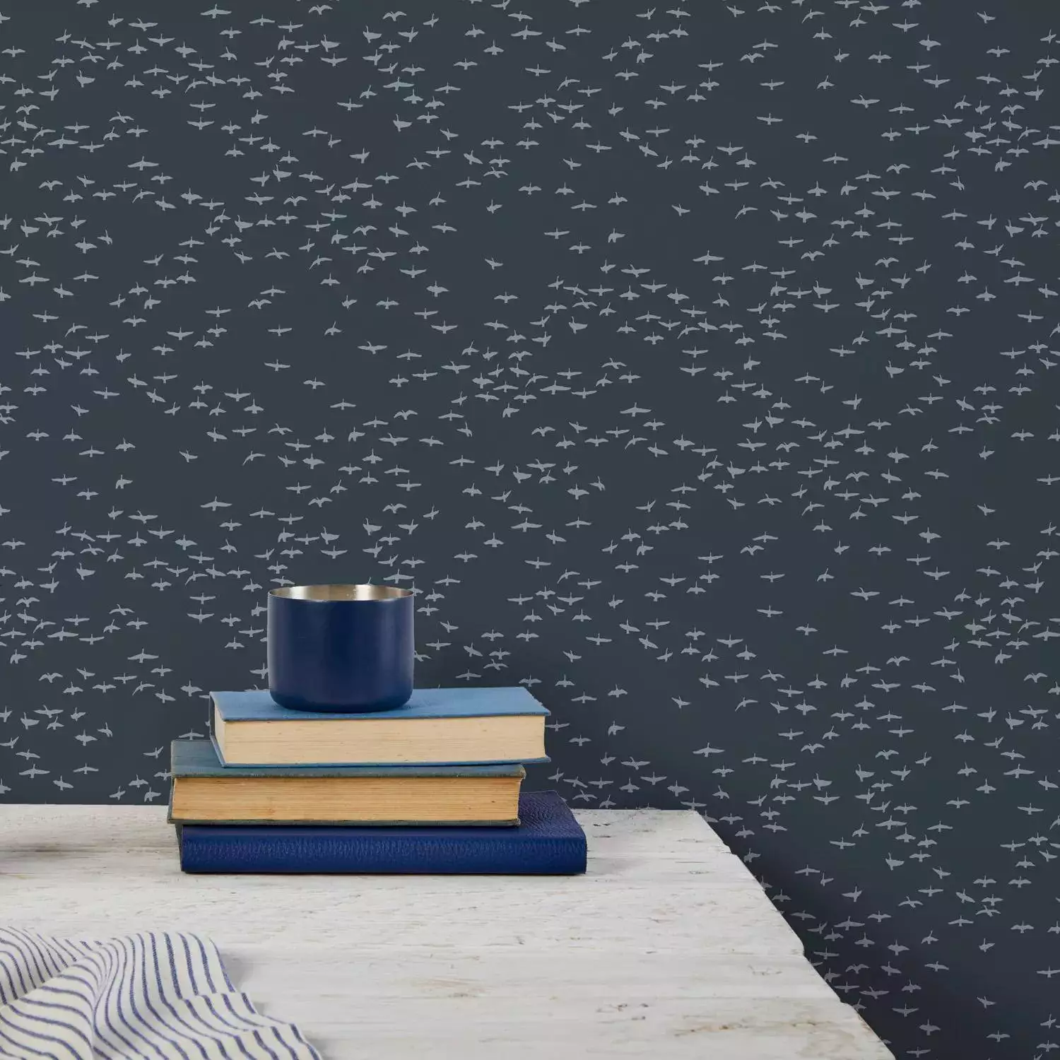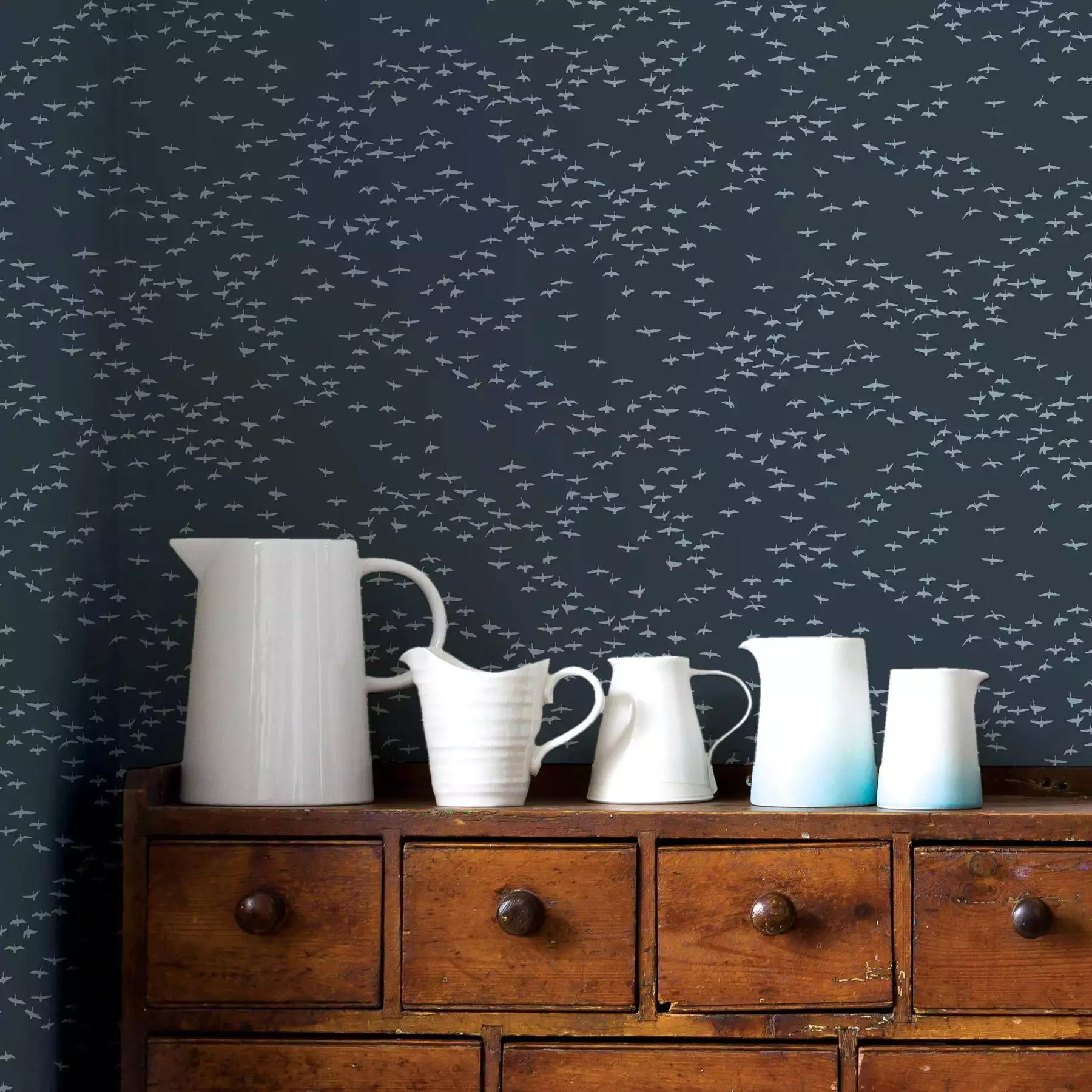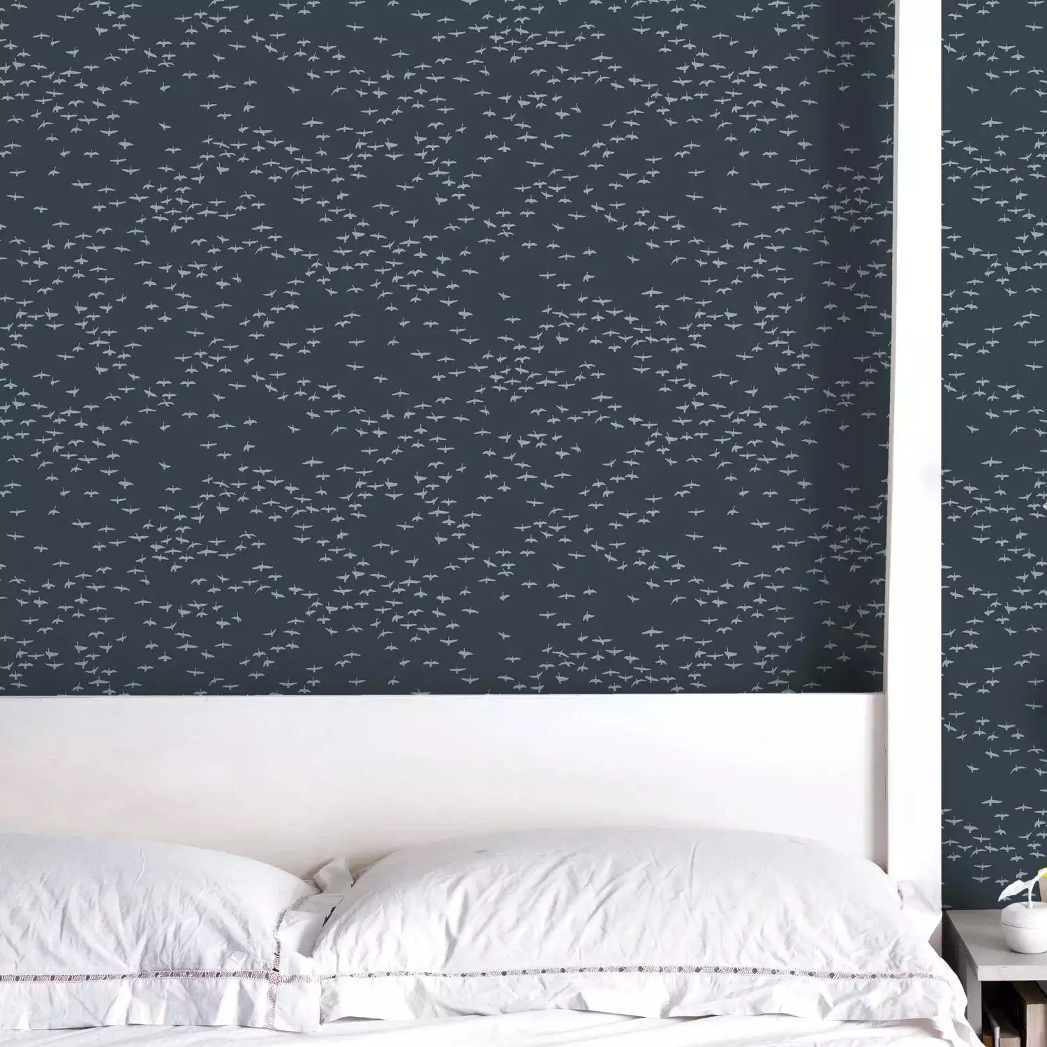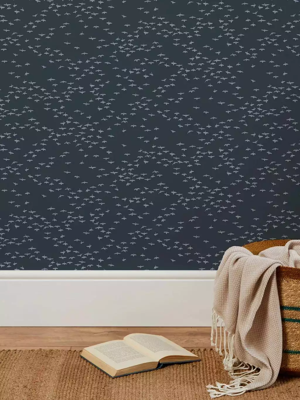 Die Tapete Migrating Birds von Bold & Noble zeigt ein ruhiges und doch unkonformes Muster aus kleinen, stilisierten Vogelsilhouetten vor einem dunklen Hintergrund. Die abstrahierte Darstellung eines Vogelschwarms in Bewegung verleiht der Wand Tiefe und Dynamik. Die dezente, gleichmäßige Anordnung sorgt für ein ruhiges Gesamtbild, das dennoch lebendig wirkt. Die Farbgebung in sanften Kontrasten schafft eine stimmungsvolle Atmosphäre, die sich sowohl für moderne als auch klassische Raumkonzepte eignet.