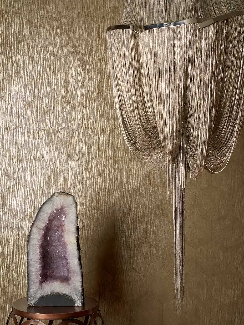 • Großformatige Muster, warme Farben und dezente Metallic-Effekte, die Tiefe und Eleganz schaffen