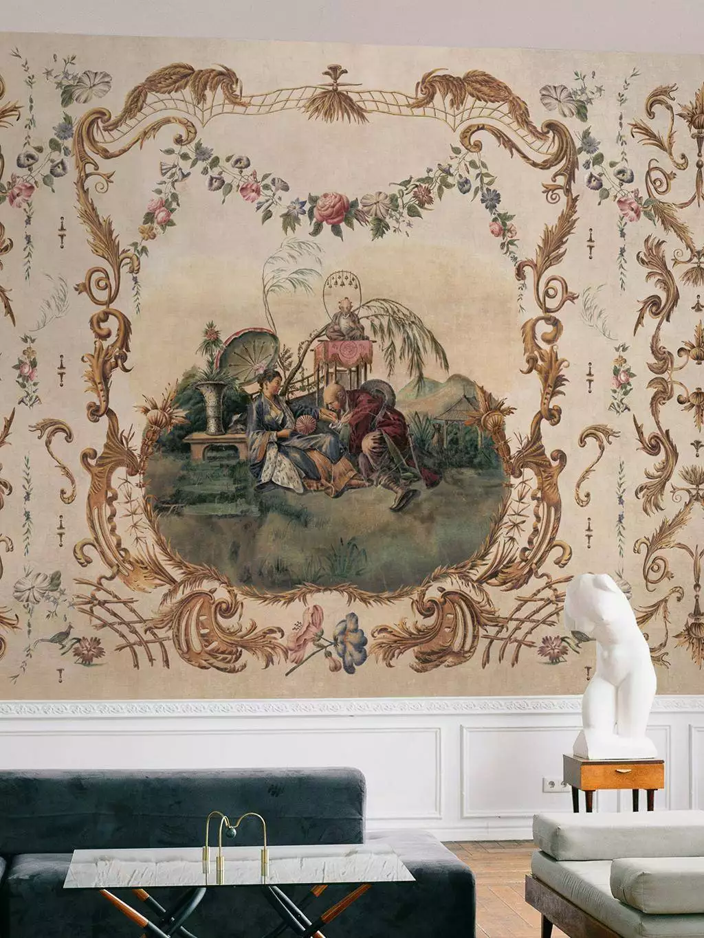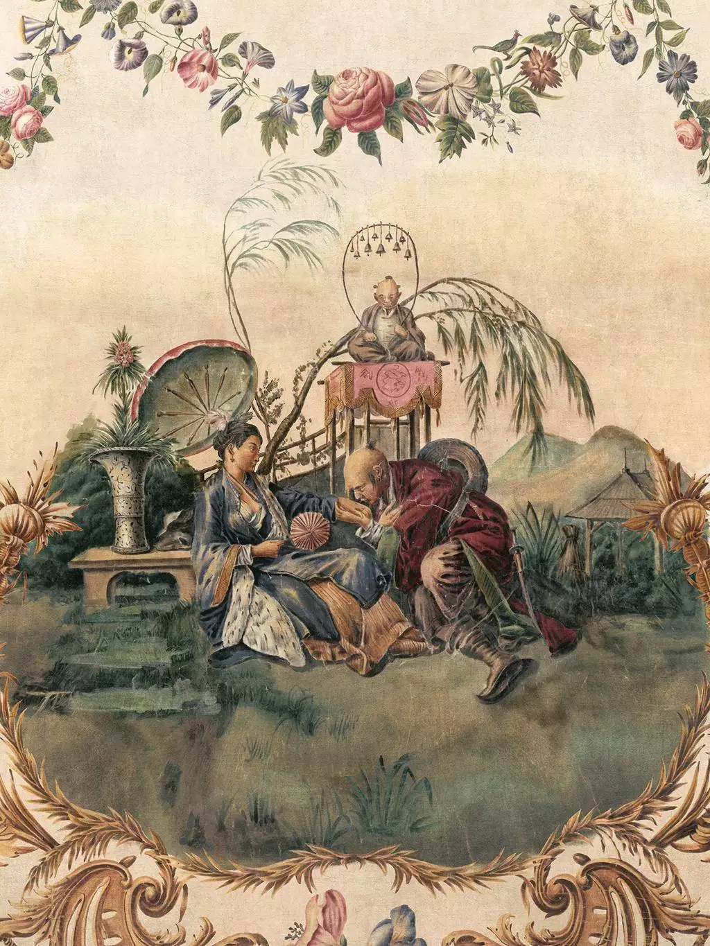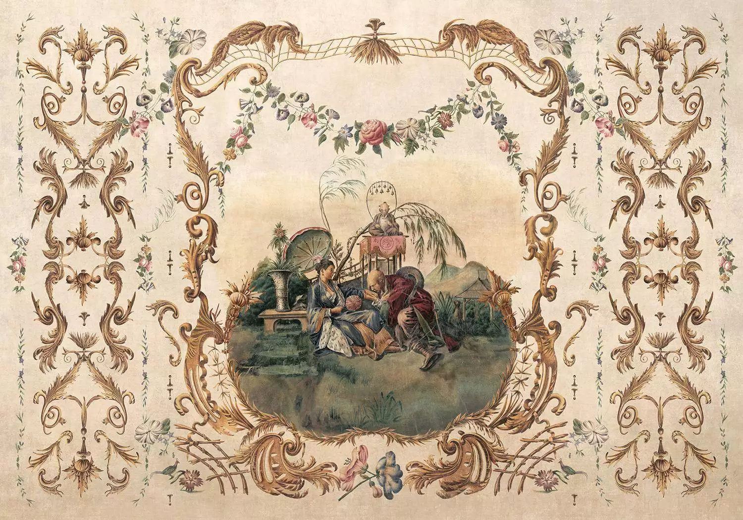 Die Tapete Ming Portrait Papyrus aus der Kollektion Forbidden City von Coordonné verbindet kunstvolle Rokoko-Ornamente mit der Eleganz der Chinoiserie. Das Design präsentiert eine detailreiche, zentrale Szene mit Figuren in traditioneller Kleidung, umgeben von exotischen Pflanzen, Schirmen und fernöstlicher Architektur. Eingefasst wird das Motiv von goldfarbenen, filigranen Barockornamenten, die durch florale Muster ergänzt werden. Der zarte Papyrus-Hintergrund in Beige verleiht der Tapete eine antike Note und betont die Harmonie zwischen den Elementen. Diese luxuriöse Wandbekleidung ist perfekt für stilvolle Interieurs, die eine historische und kulturelle Atmosphäre mit einem Hauch von Exotik schaffen möchten.