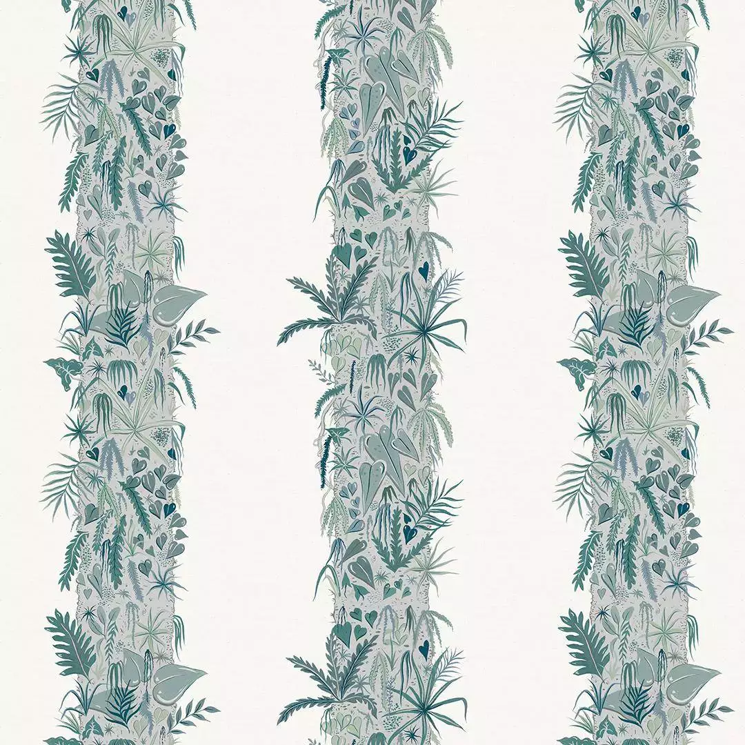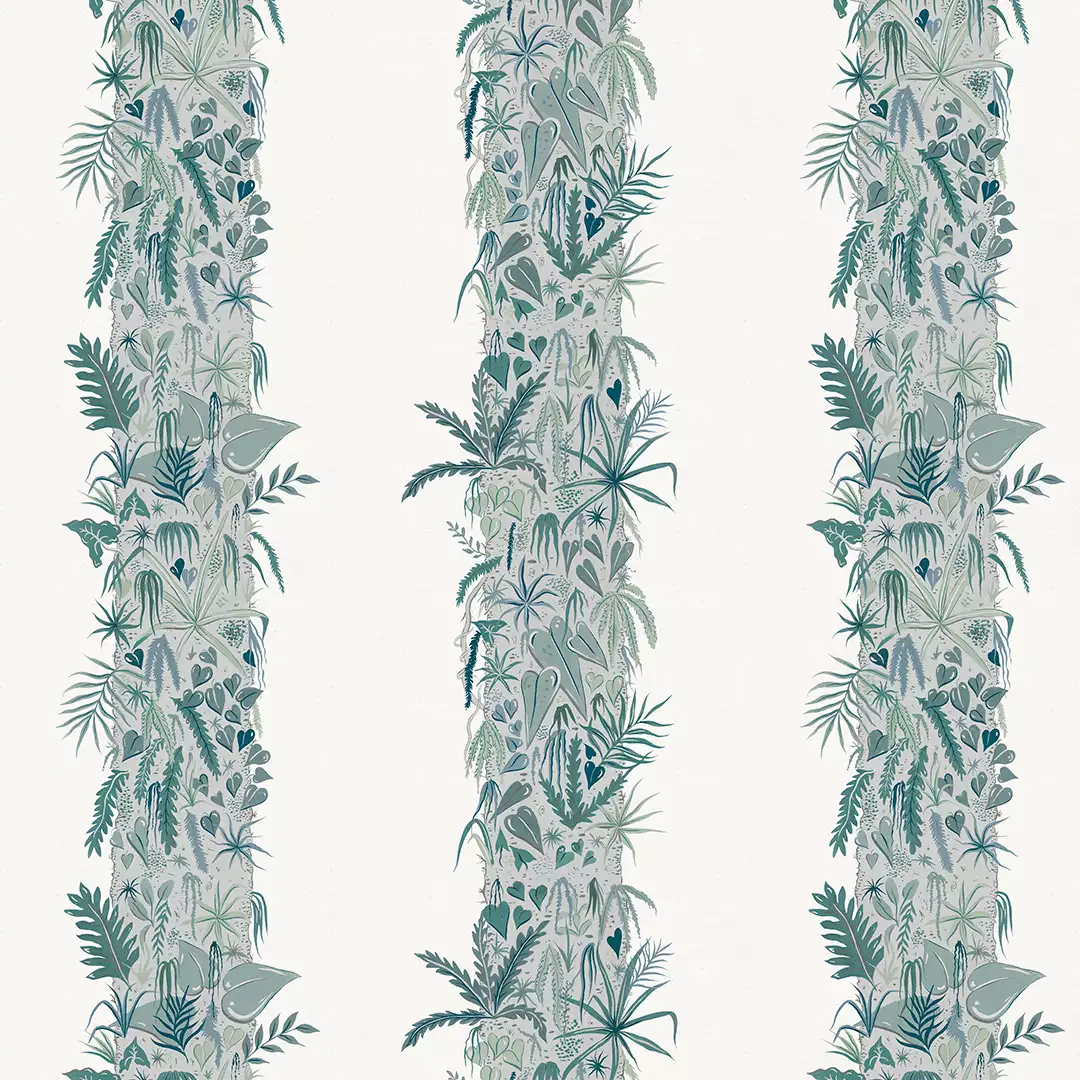 Die Tapete 'Monte Verde' zeigt mit Pflanzen bewachsene Baumstämme, eingetaucht in einen sanften Mondstein-Blauton. Das Design zieht ihre Inspiration aus dem Nebelwald in Costa Rica. Dort herrscht eine Luftfteuchtigkeit von Nahe zu 100%. Diese feuchte Umgebung ermöglichte die Entstehung von Ökosystemen innerhalb von Ökosystemen, wie dieser Tapete.