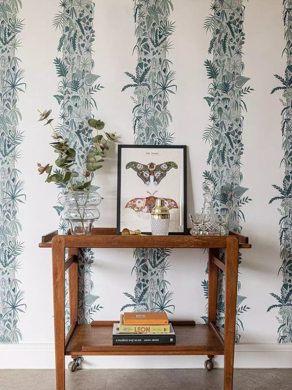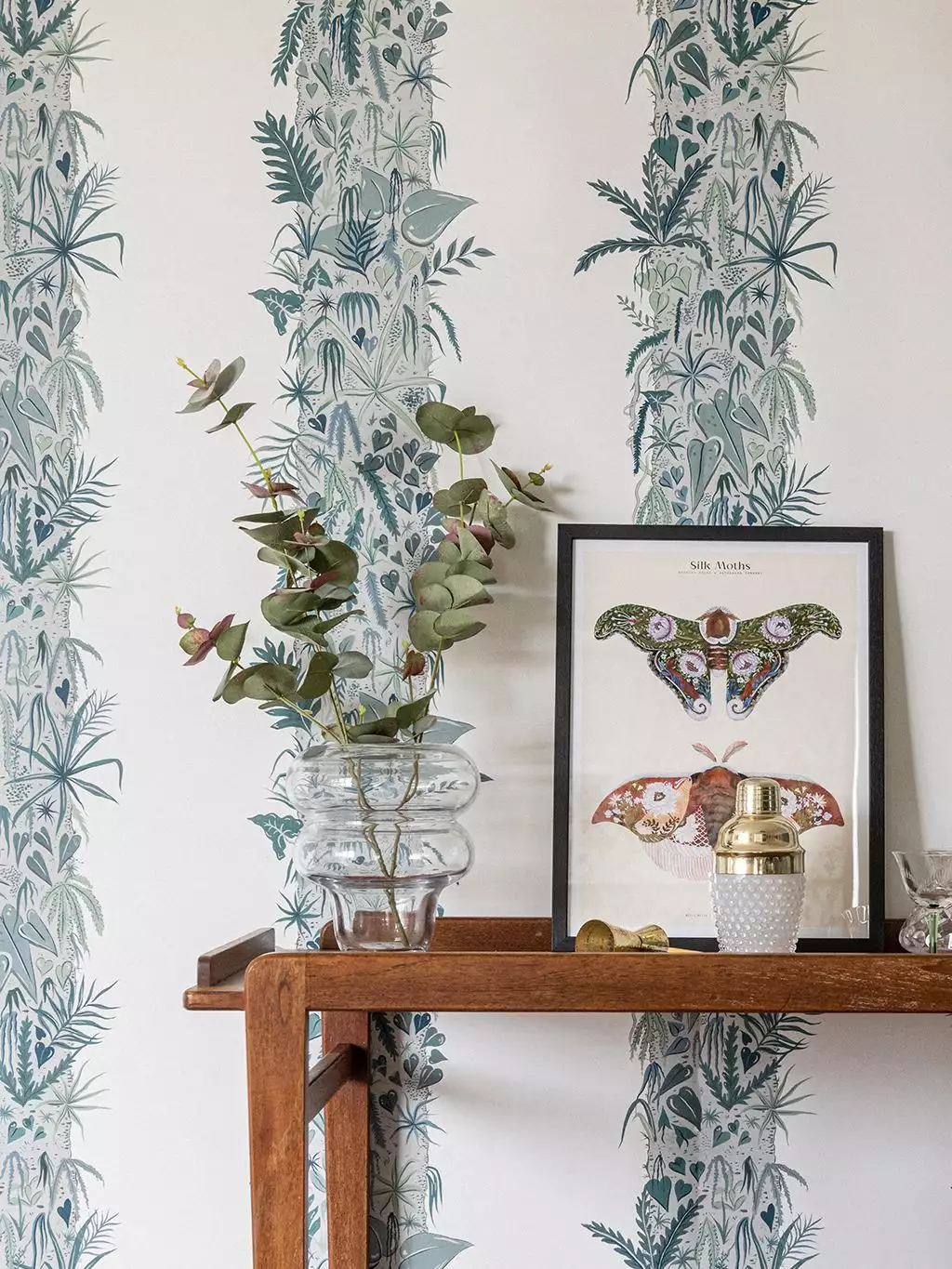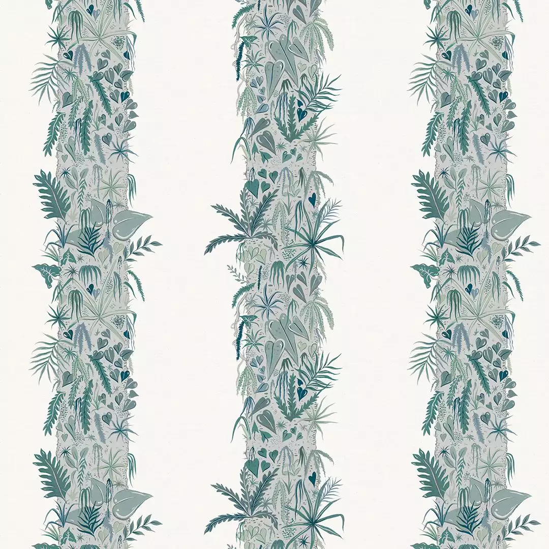 Die Tapete 'Monte Verde' zeigt mit Pflanzen bewachsene Baumstämme, eingetaucht in einen sanften Mondstein-Blauton. Das Design zieht ihre Inspiration aus dem Nebelwald in Costa Rica. Dort herrscht eine Luftfteuchtigkeit von Nahe zu 100%. Diese feuchte Umgebung ermöglichte die Entstehung von Ökosystemen innerhalb von Ökosystemen, wie dieser Tapete.