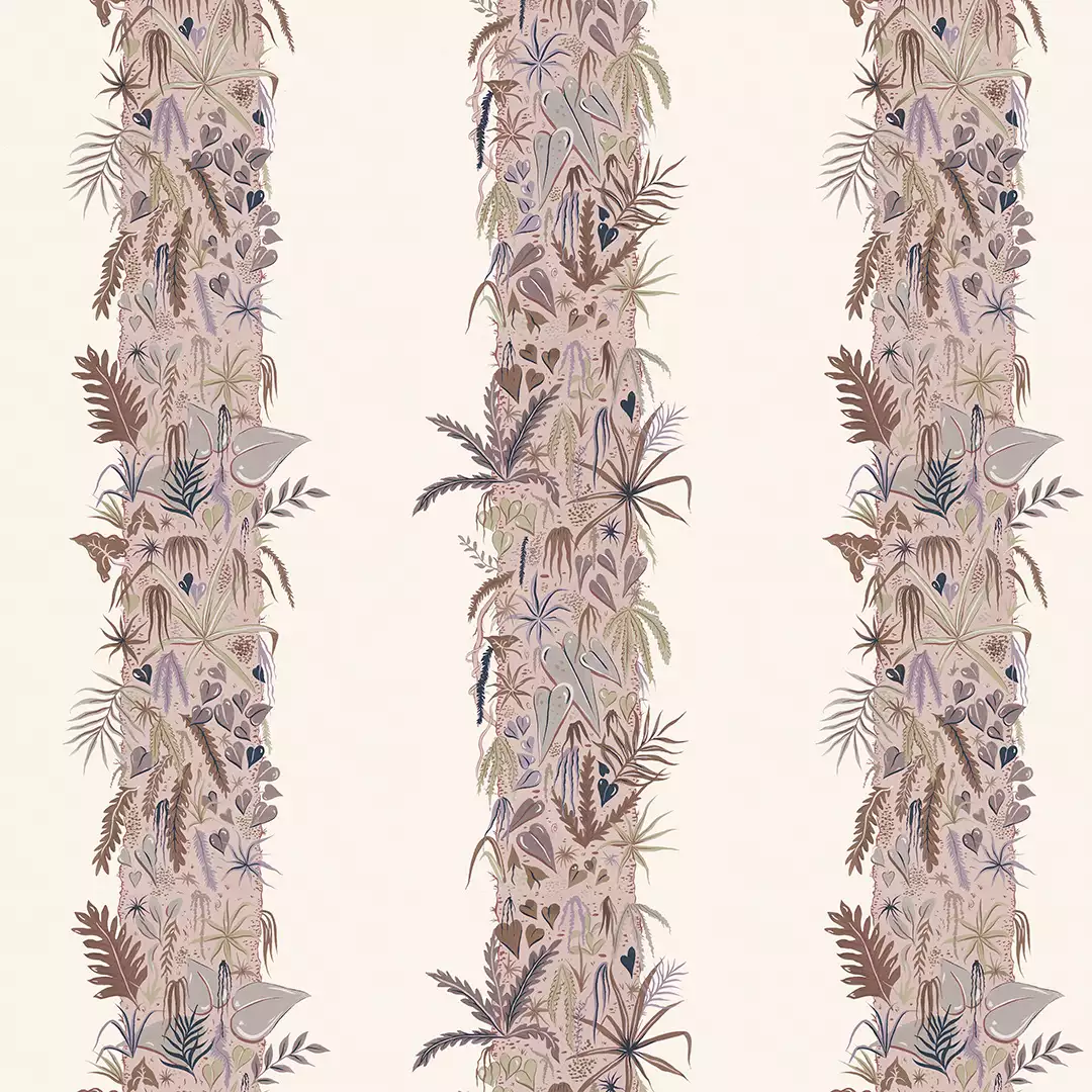 Die Tapete 'Monte Verde' zeigt mit Pflanzen bewachsene Baumstämme, eingetaucht in einen sanften Morganite-Pink.Das Design zieht ihre Inspiration aus dem Nebelwald in Costa Rica. Dort herrscht eine Luftfteuchtigkeit von Nahe zu 100%. Diese feuchte Umgebung ermöglichte die Entstehung von Ökosystemen innerhalb von Ökosystemen, wie dieser Tapete.