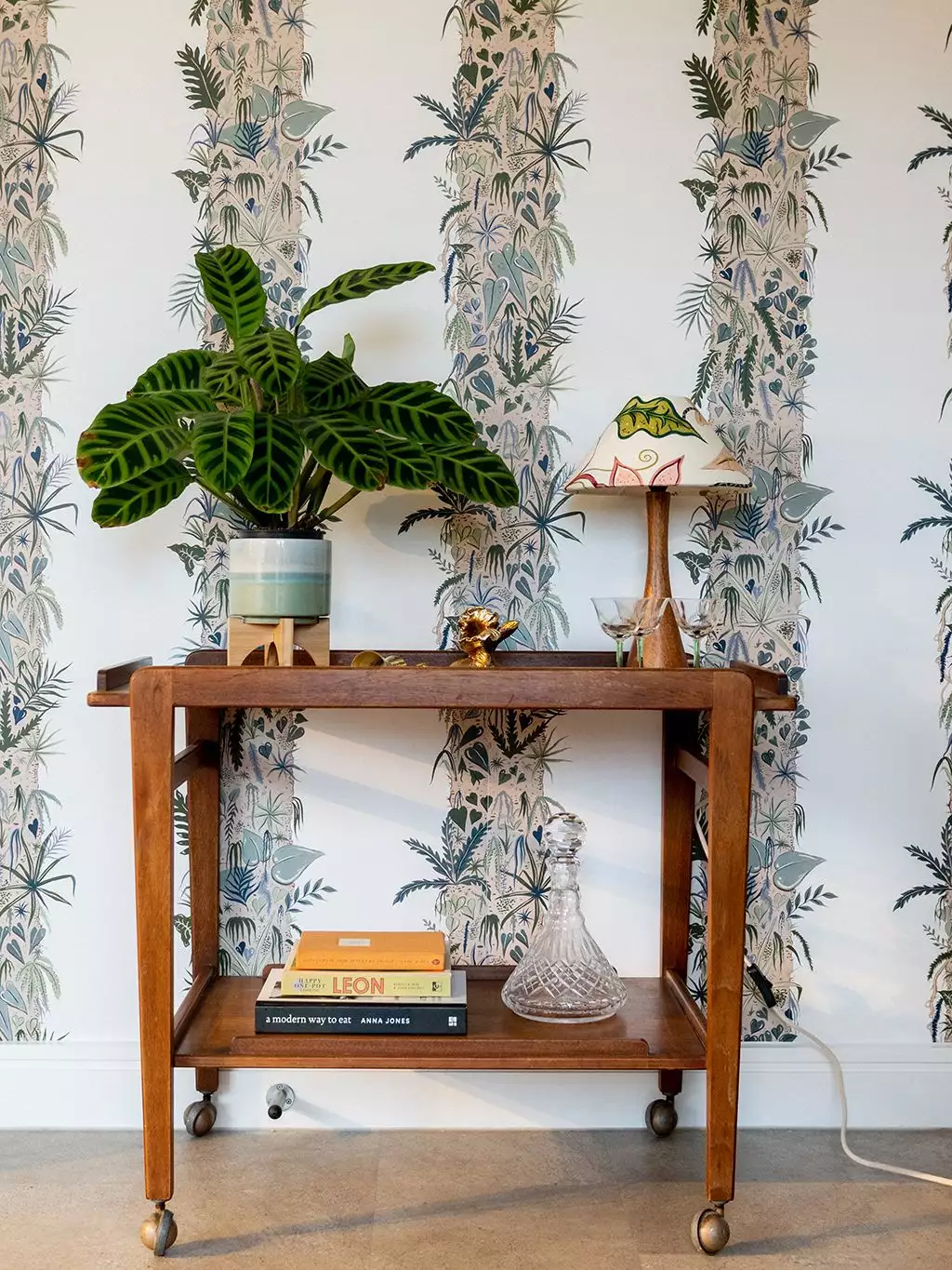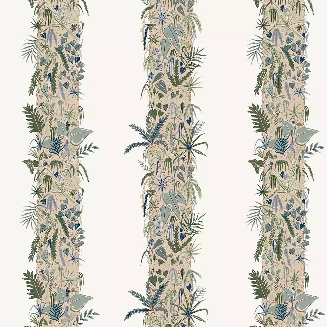 Die Tapete 'Monte Verde' zeigt mit Pflanzen bewachsene Baumstämme, eingetaucht in einen sanften Opalite, aus milichigen Blau und Weiß Tönen. Das Design zieht ihre Inspiration aus dem Nebelwald in Costa Rica. Dort herrscht eine Luftfteuchtigkeit von Nahe zu 100%. Diese feuchte Umgebung ermöglichte die Entstehung von Ökosystemen innerhalb von Ökosystemen, wie dieser Tapete.