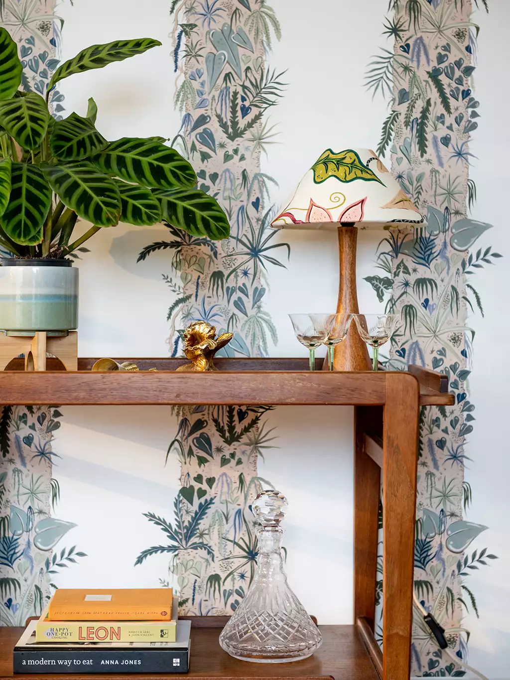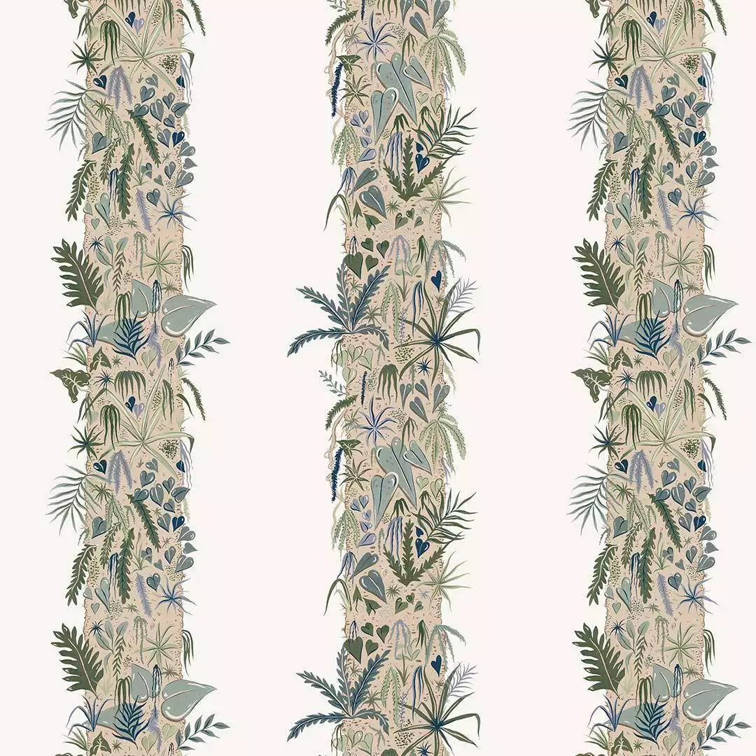 Die Tapete 'Monte Verde' zeigt mit Pflanzen bewachsene Baumstämme, eingetaucht in einen sanften Opalite, aus milichigen Blau und Weiß Tönen. Das Design zieht ihre Inspiration aus dem Nebelwald in Costa Rica. Dort herrscht eine Luftfteuchtigkeit von Nahe zu 100%. Diese feuchte Umgebung ermöglichte die Entstehung von Ökosystemen innerhalb von Ökosystemen, wie dieser Tapete.