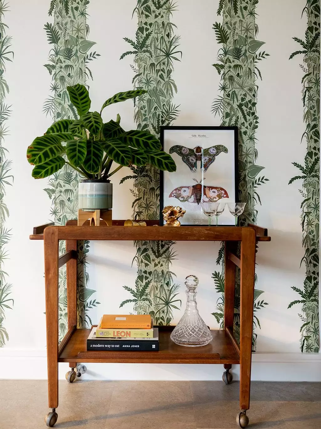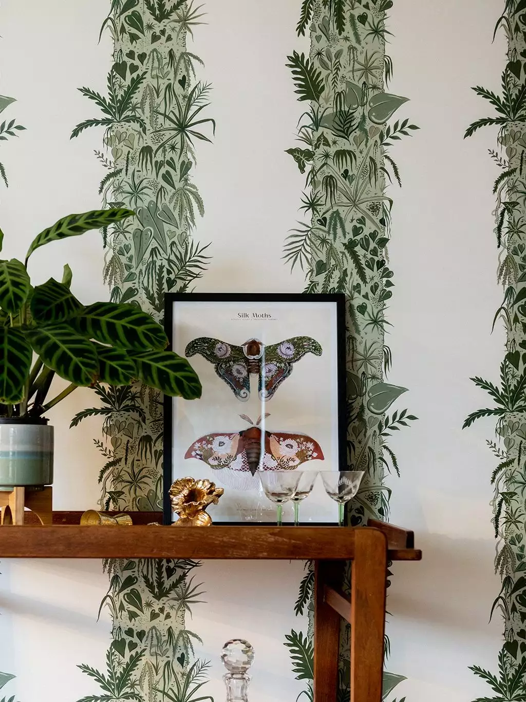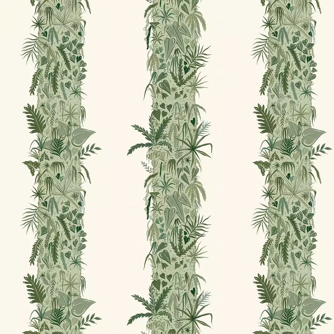 Die Tapete 'Monte Verde' zeigt mit Pflanzen bewachsene Baumstämme, eingetaucht in einen sanften Serpentine-Green. Das Design zieht ihre Inspiration aus dem Nebelwald in Costa Rica. Dort herrscht eine Luftfteuchtigkeit von Nahe zu 100%. Diese feuchte Umgebung ermöglichte die Entstehung von Ökosystemen innerhalb von Ökosystemen, wie dieser Tapete.