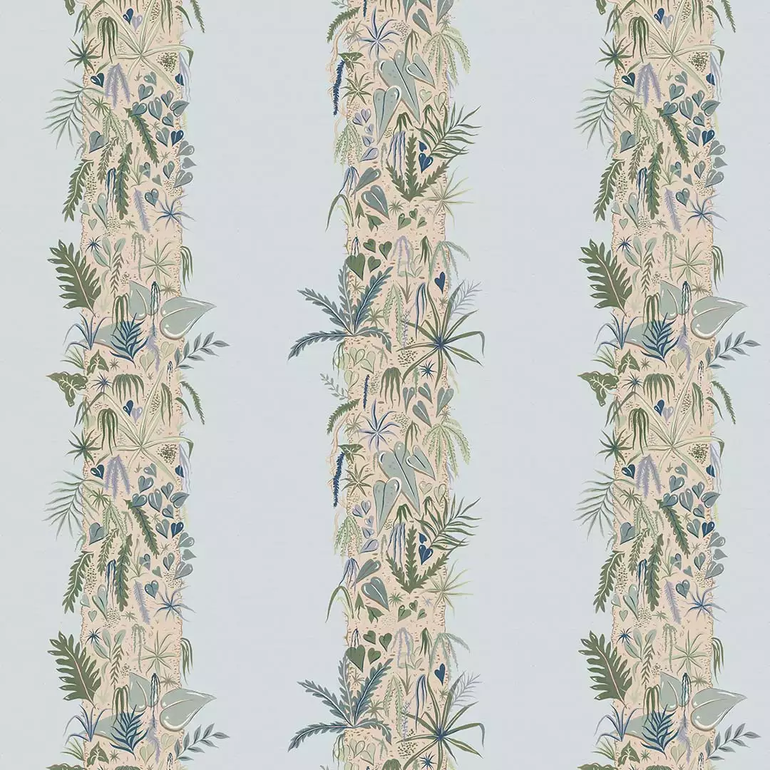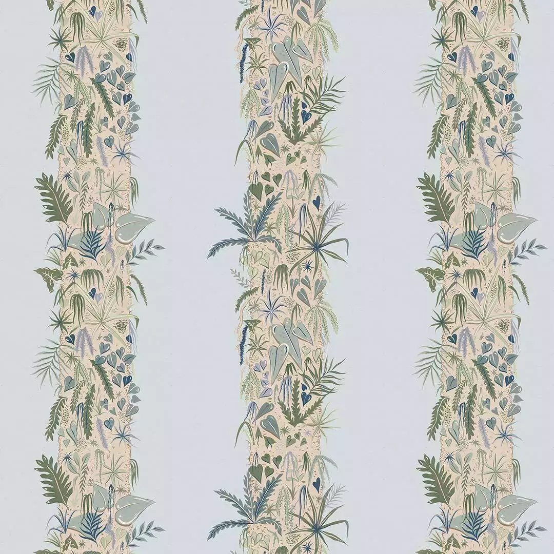 Die Tapete 'Monte Verde' zeigt mit Pflanzen bewachsene Baumstämme, eingetaucht in einen sanften Sky-Blue.Das Design zieht ihre Inspiration aus dem Nebelwald in Costa Rica. Dort herrscht eine Luftfteuchtigkeit von Nahe zu 100%. Diese feuchte Umgebung ermöglichte die Entstehung von Ökosystemen innerhalb von Ökosystemen, wie dieser Tapete.