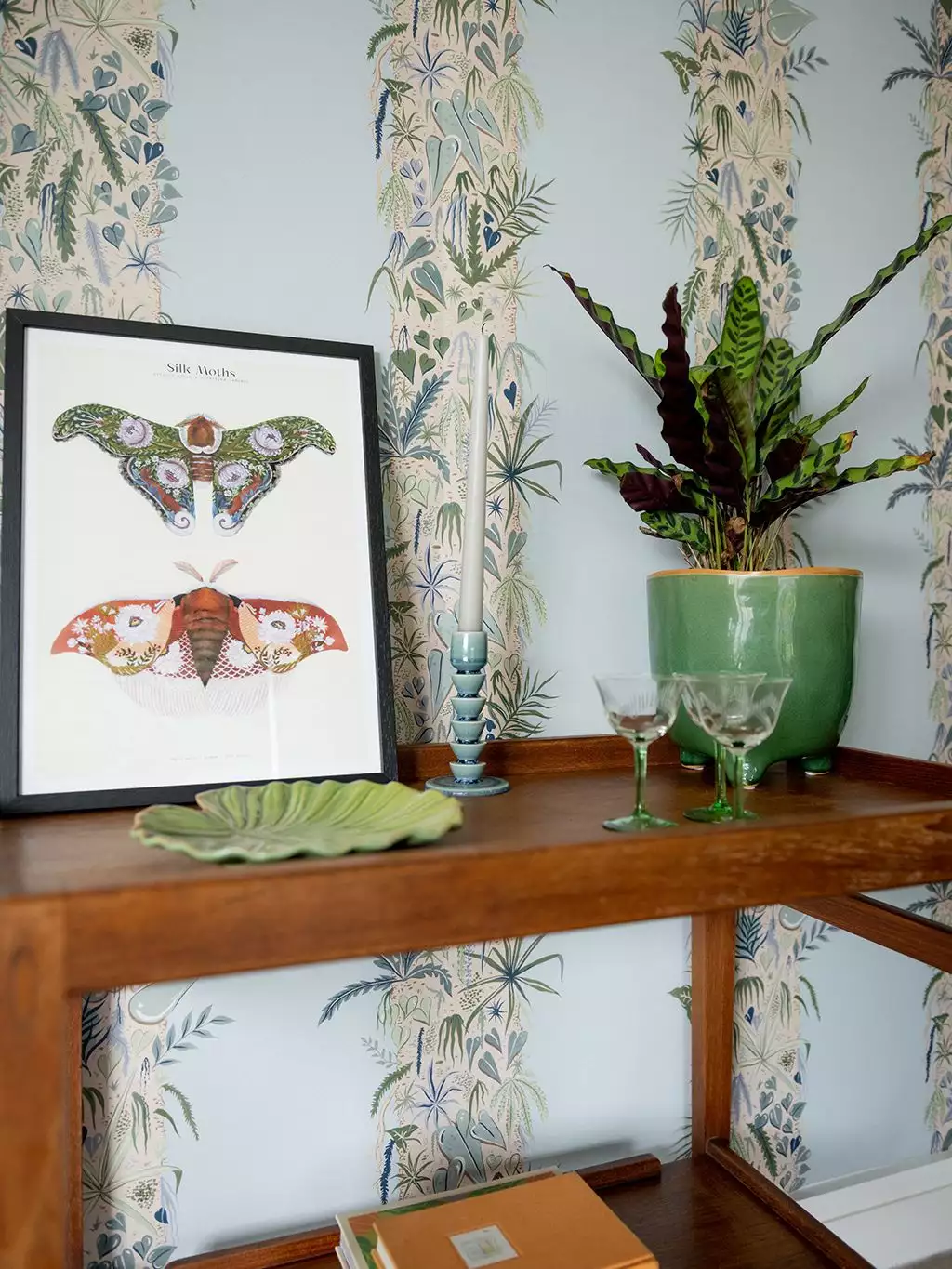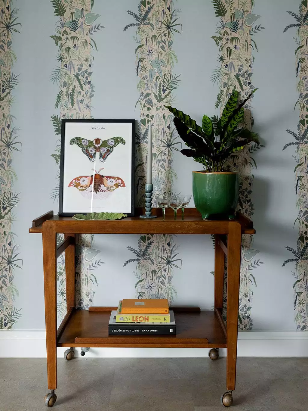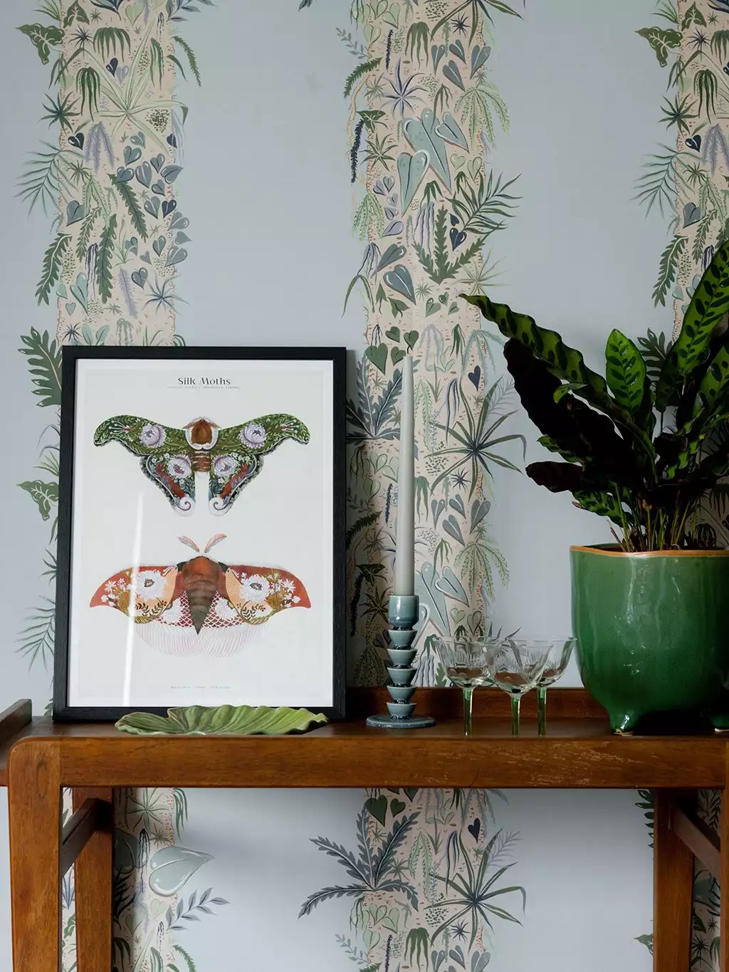Die Tapete 'Monte Verde' zeigt mit Pflanzen bewachsene Baumstämme, eingetaucht in einen sanften Sky-Blue.Das Design zieht ihre Inspiration aus dem Nebelwald in Costa Rica. Dort herrscht eine Luftfteuchtigkeit von Nahe zu 100%. Diese feuchte Umgebung ermöglichte die Entstehung von Ökosystemen innerhalb von Ökosystemen, wie dieser Tapete.