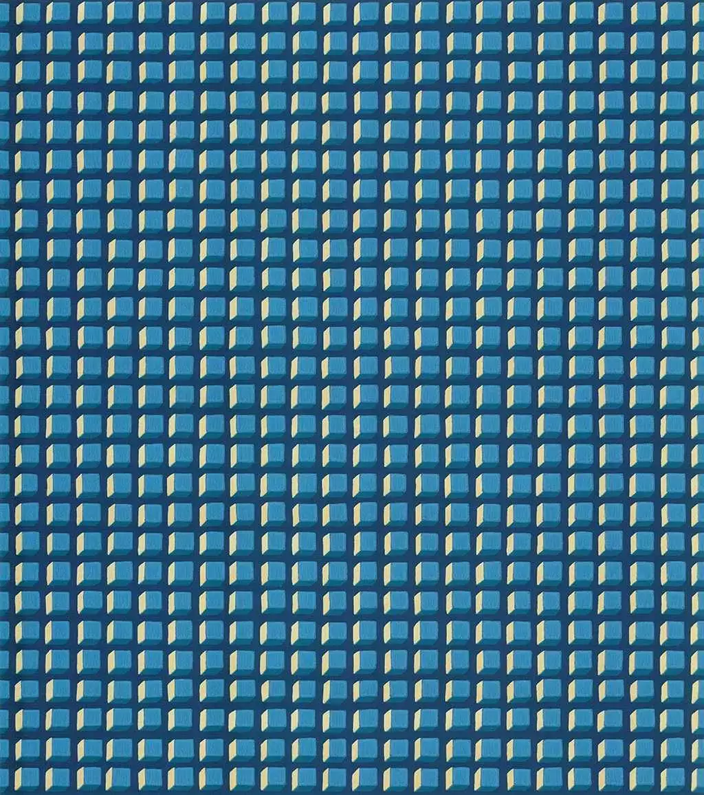 Das elegante, zierliche Würfeldesign von Mosaicsteinen ist von der Symmetrie und den Fliesenarbeiten der Art déco Bewegung inspiriert. Das Farbkonzept besteht aus Petrol auf Tinte.