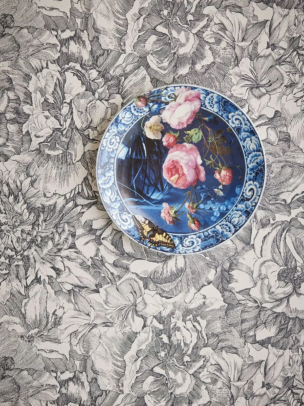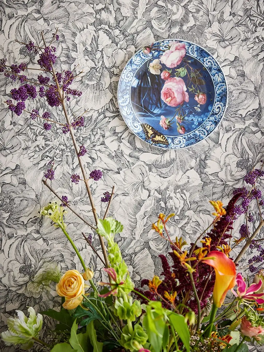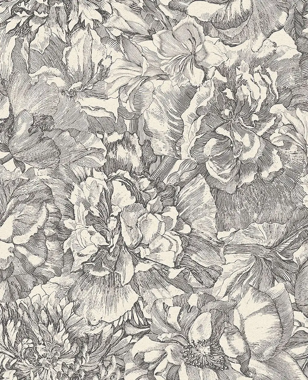 Mit ihrem großflächigen schwarz-weißem Blumenmuster und den fein gezeichneten Rosen und Nelken lässt diese Tapete jede Wand erstrahlen. Das Design ist inspiriert von den Stichen niederländischer Meister und zeugt von höchster Qualität und Handwerkskunst. Durch die Schattierungen erhält die Wand eine unglaubliche Tiefe und wird zum Blickfang in jedem Raum.