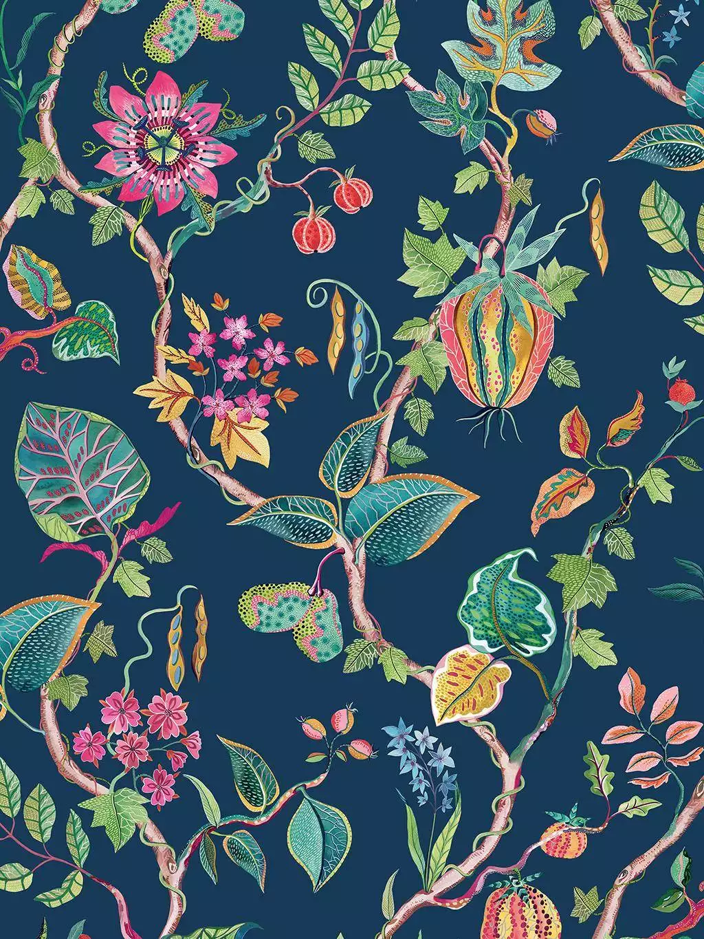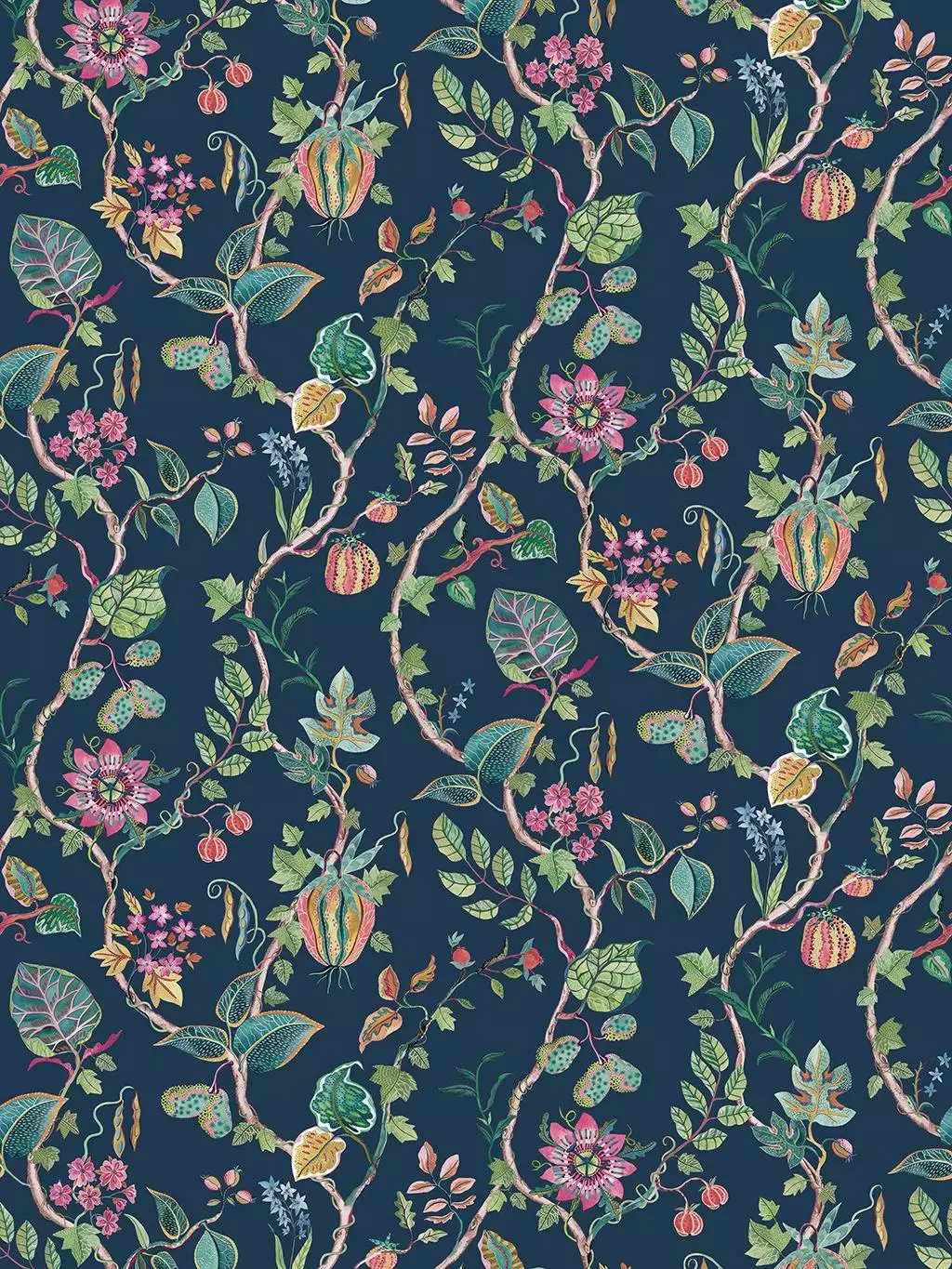 Die Tapete Mythica präsentiert ein fantasievolles Muster aus Passionsfruchtblüten, Samenkapseln und Zierkürbissen.