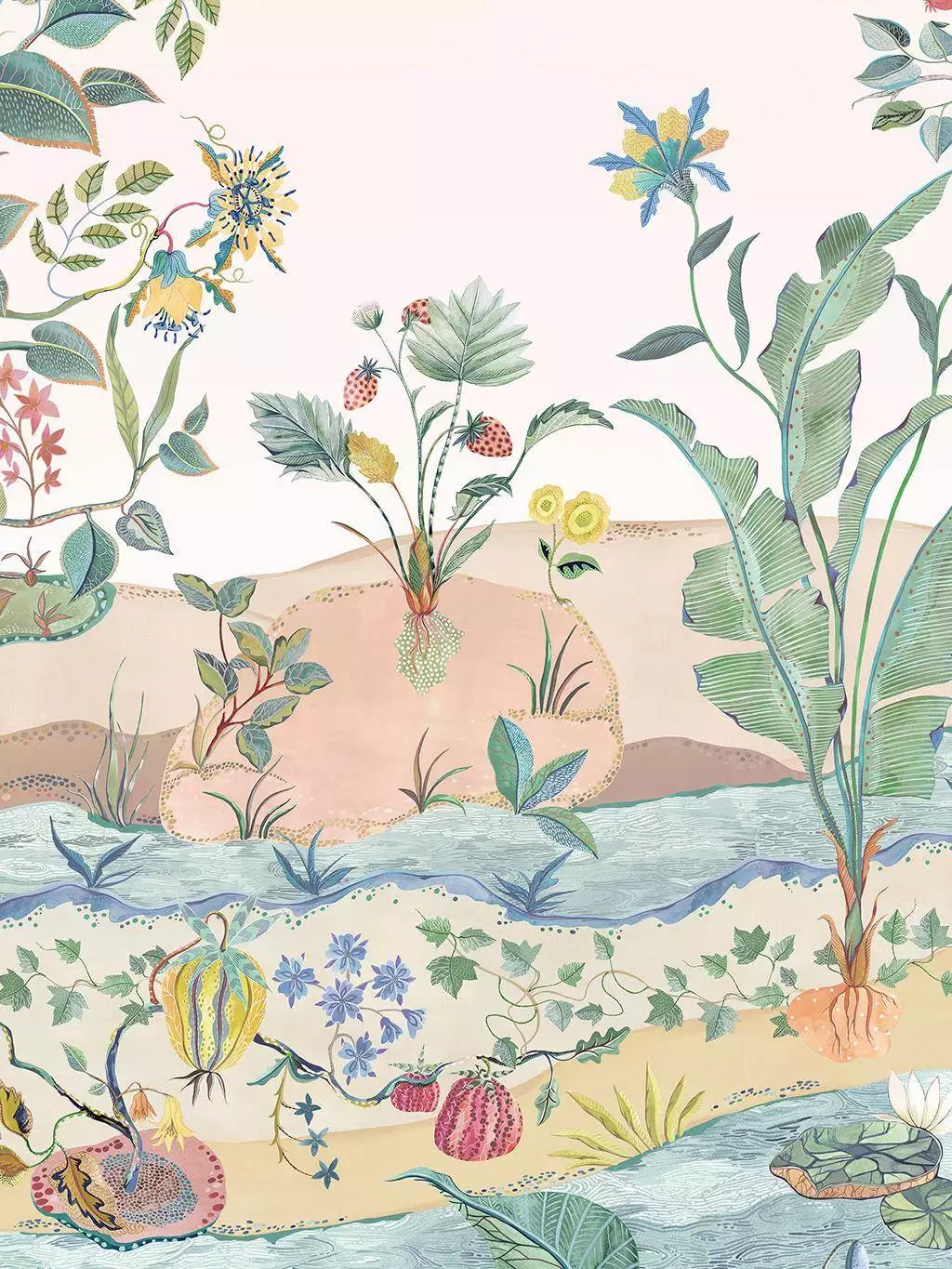 Auf dieser Tapete wachsen fantasievolle Bäume und Pflanzen entlang eines malerischen Baches. Die Szene erstreckt