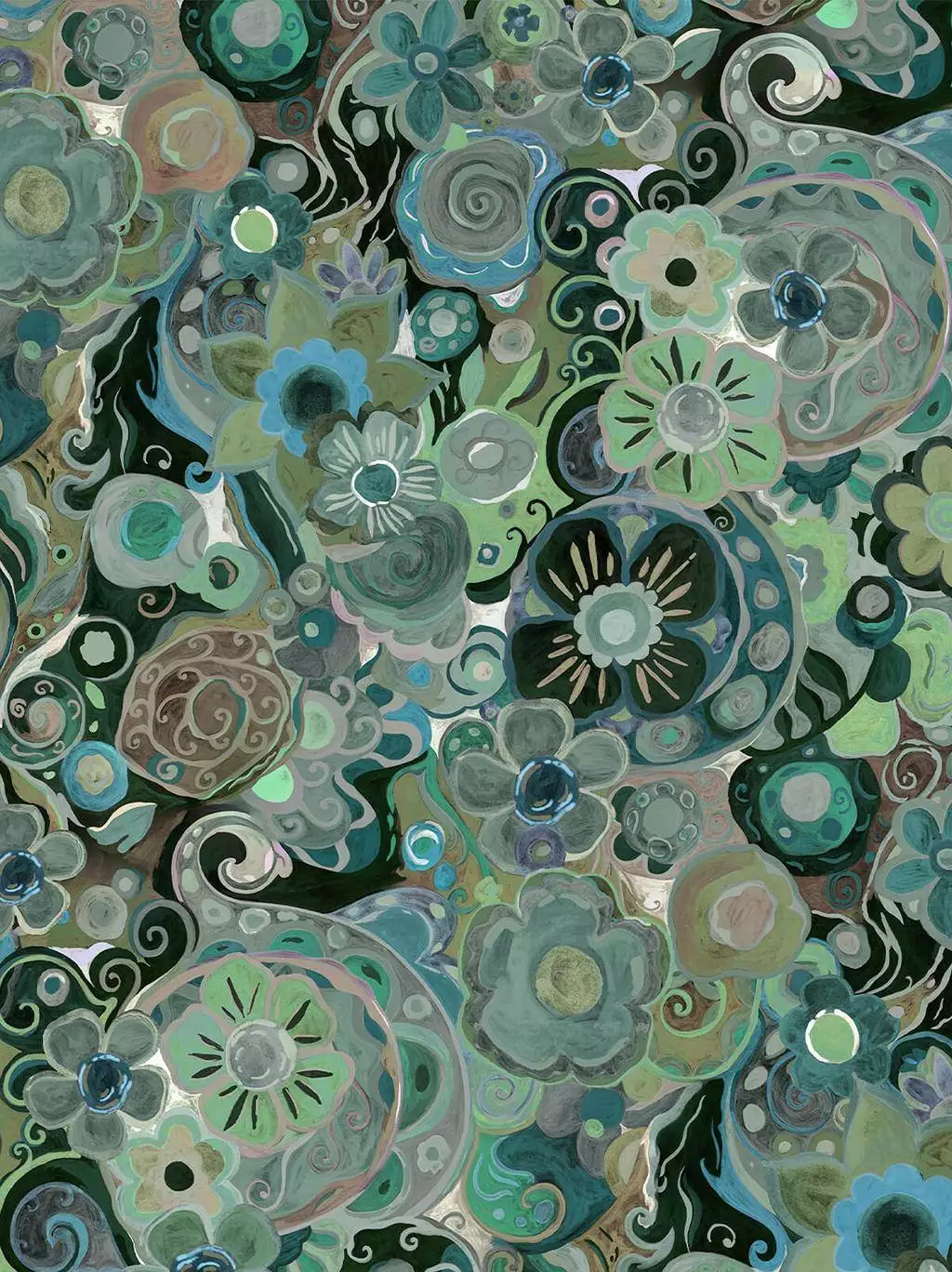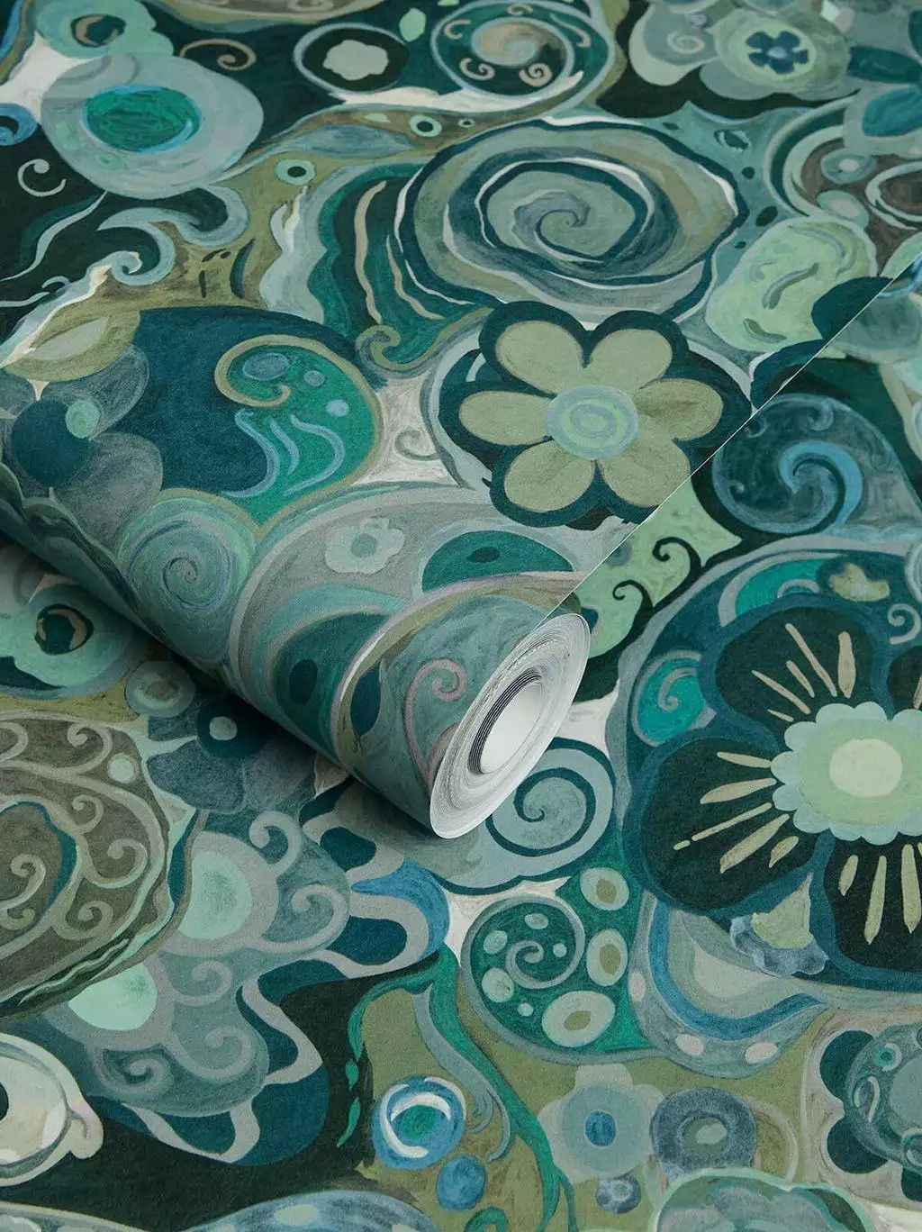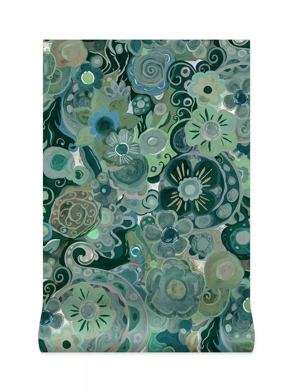 Tauchen Sie ein in eine Welt aus Formen und Farben mit dieser blau-grünen Blumentapete von House of Hackney. Inspiriert von der Natur, vereinen sich florale Muster und geschwungene Formen zu einem hypnotisierenden Design. Die Blau- und Grüntöne wirken beruhigend, während feine Details einen Hauch von Bewegung in den Raum bringen.